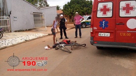 Por volta das 8h30m desta segunda-feira, 11/08, a guarnição da Polícia Militar foi acionada via Central de Operações a comparecer na Rua Turmalina no Bairro Parque das Gemas em Ariquemes, onde havia acontecido um atropelamento a um idoso. De imediato os PM’s foram até o local onde constataram a veracidade das informações, se depararam com a vítima A.P.J. de 62 anos de idade, caído ao solo sentindo fortes dores por todo o corpo e sua bicicleta completamente destruída. Ao coletar as informações do que teria acontecido, a guarnição composta pelos PM’s Soldado Vanjura e Soldado Jean Carlos foi informada por populares que presenciaram o fato de que o idoso transitava pelo local conduzindo uma bicicleta marca Gênova de cor preta, quando em dado momento o condutor de uma motocicleta colidiu na traseira da bicicleta a qual o idoso conduzia. Em ato contínuo o motociclista fugiu do local tomando rumo ignorado sem prestar socorro à vítima. Após receber os primeiros socorros o idoso foi conduzido ao Hospital Regional de Ariquemes para receber cuidados médicos especializados. Os PM’s fizeram diligências pelas proximidades do bairro, mas não localizaram o motociclista infrator. Diante dos fatos foi registrado o Boletim de Ocorrência Policial sob N°5550/2014 na 1ª Delegacia Geral de Polícia Civil de Ariquemes, para que sejam tomadas as providências cabíveis ao caso.