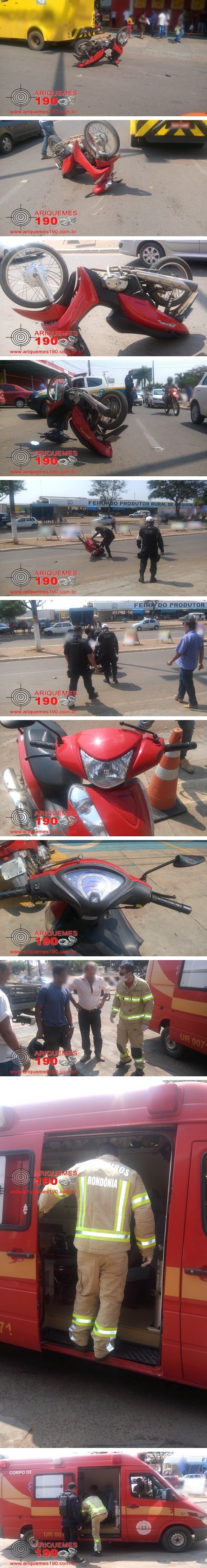 Os acidentes de trânsito na cidade de Ariquemes estão cada vez mais comuns. Nesta quinta-feira, 28/08, um acidente envolvendo uma motoneta e um carro deixou um motociclista ferido. Por volta das 10h40m a guarnição do Corpo de Bombeiros de Ariquemes foi acionada a comparecer na Avenida Tancredo Neves, em frente a Feira do Produtor Rural, aonde havia acabado de acontecer um acidente de trânsito e teria uma vítima ferida ao solo. Imediatamente os Bombeiros R. Souza e Reis compareceram no local, onde constataram a veracidade das informações. Foram iniciados os procedimentos de primeiros socorros e o motociclista foi conduzido ao Hospital Regional pela ambulância do Corpo de Bombeiros para receber o atendimento médico especializado. A Central de Operações da Polícia Militar também recebeu a informação e acionou uma viatura para comparecer no endereço supracitado. Chegando no local os Militares começaram a coletar os dados, onde segundo informações de populares, o condutor da motoneta da marca Honda, modelo Biz de cor vermelha transitava a Avenida, quando em dado momento tentou desviar de um Carro Forte que estava estacionado em frente a um supermercado. O motociclista tentou desviar, mas foi inevitável a colisão com a lateral do veículo da marca Chevrolet, modelo Celta de cor prata. Após esta colisão a motoneta tombou e o condutor caiu ao solo onde permaneceu até a chegada do socorro. Foi constatado pelos PM’s que a documentação do veículo estava atrasada e ao verificar a Carteira de Habilitação do condutor do carro, os Militares puderam constatar que a mesma se encontrava vencida. O carro foi apreendido e conduzido ao pátio do Ciretran para a tomada de providências cabíveis. Diante dos fatos foi registrado o Boletim de Ocorrência Policial e o Boletim de Ocorrência de Acidente de Trânsito (BOAT), para posterior tomada de providências constantes no Código de Trânsito Brasileiro (CTB).