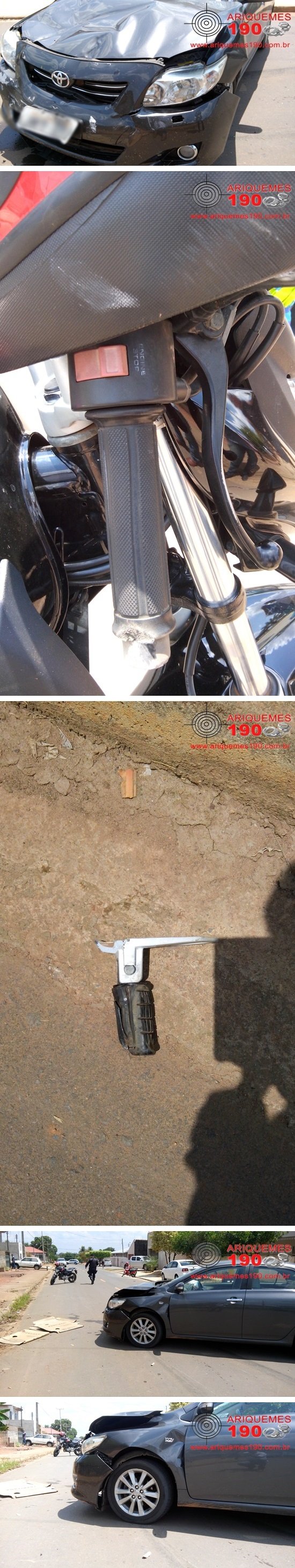 Por volta das 12h00m desta terça-feira, 02/09, a guarnição da Polícia Militar foi acionada via Central de Operações a comparecer na Rua Quatro Cachoeiras, esquina com a 12ª Rua do Setor 03 em Ariquemes, onde havia acontecido um acidente de trânsito. De imediato os Militares se deslocaram até o local, onde constataram a veracidade das informações, se deparando com o motociclista já sendo socorrido ao Hospital Regional de Ariquemes. A vítima apresentava escoriações pelo corpo e uma possível fratura em um dos dedos do pé. Ao coletar os dados do que havia acontecido, os Militares foram informados que o condutor da motocicleta da marca Honda, modelo CB-300 de cor preta transitava a Rua Quatro Cachoeiras, quando em um cruzamento veio a colidir com o veículo da marca Toyota, modelo Corolla de cor grafite. Após a colisão o motociclista caiu ao solo onde permaneceu até a chegada do socorro. O veículo teve muitas avarias na parte da frente que ficou completamente destruída. Diante dos fatos, foi registrado o Boletim de Ocorrência Policial (BOP) e o Boletim de Ocorrência de Acidente de Trânsito (BOAT), para posterior tomada de providências constantes no Código de Trânsito Brasileiro (CTB).