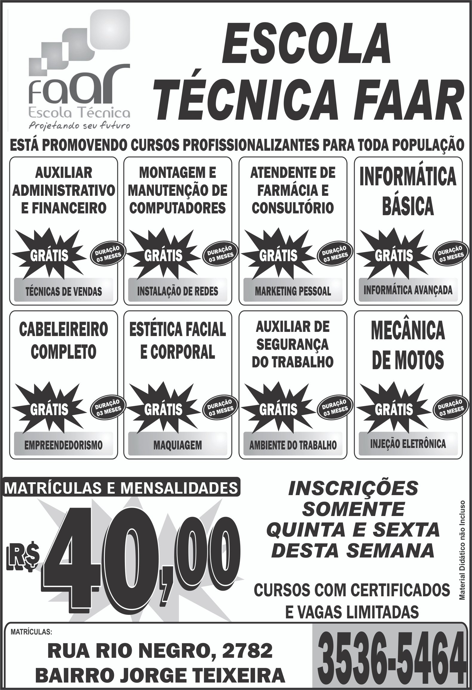 A Escola Técnica FAAR está promovendo diversos cursos. Venha fazer um de nossos cursos por apenas R$ 40,00 mensais, isso mesmo, apenas R$ 40,00. Fazendo um curso, você ganha outro grátis.