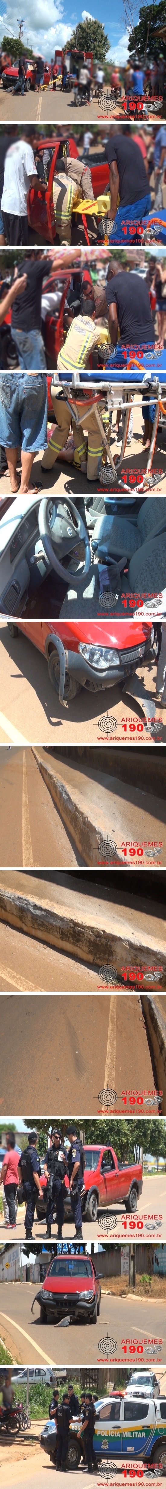Por volta das 13h25m desta quarta-feira, 07/01, a guarnição da Polícia Militar foi acionada a comparecer na Avenida Canaã no Setor 02 de Ariquemes, pois segundo informações havia acontecido um grave acidente de trânsito. De imediato a guarnição compareceu no local, onde constatou a veracidade das informações, se deparando com a equipe de socorro do Corpo de Bombeiros já prestando os primeiros socorros para a condutora que estava desacordada. Ao levantar informações do que havia acontecido, populares informaram que a condutora do veículo marca Fiat, modelo Strada de cor vermelho subia a Avenida Canaã do Setor 02 sentido ao Bairro 25 de Dezembro, quando em dado momento um ciclista atravessou em sua frente. Para não atropelar o ciclista, a condutora do veículo desviou colidindo com o meio fio e perdendo o controle da direção. Após a condutora ser imobilizada foi conduzida ao Hospital Regional para receber cuidados médicos especializados. Diante dos fatos foi registrado o Boletim de Ocorrência Policial (BOP) sob n°164/2015 e o Boletim de Ocorrência de Acidente de Trânsito (BOAT) para posterior tomada de providências constantes no Código de Trânsito Brasileiro (CTB).