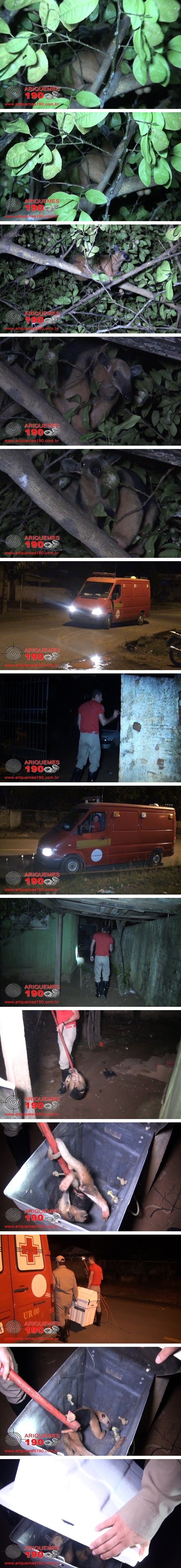 Na noite desta quarta-feira, 14/01, a equipe de resgate do Corpo de Bombeiros foi acionada a comparecer na 1ª Rua do Setor 04 de Ariquemes, pois segundo informações no local havia sido encontrado um Tamanduá. De imediato os Bombeiros se deslocaram ao local onde constataram a veracidade das informações, se deparando com o animal em cima de uma árvore. Rapidamente foram iniciados os trabalhos de captura, onde o animal foi colocado em uma caixa sem que machucasse ninguém. Após alguns minutos os Bombeiros conseguiram colocar o animal na caixa onde no interior da mesma o Tamanduá foi transportado pera seu habitat natural e posteriormente libertado. Fica o alerta para a comunidade, quando avistar qualquer animal silvestre em perímetro urbano ligar para o Corpo de Bombeiros no número funcional 192, para que o animal seja resgatado sem que coloque pessoas ou o próprio animal em risco, e seja posteriormente devolvido à natureza de onde veio.