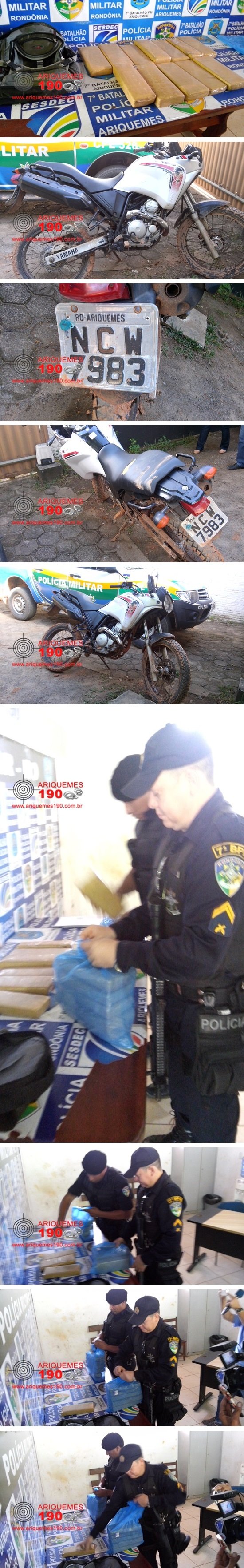 Na tarde desta quarta-feira, 08/04 por volta das 14h00m, a guarnição da Polícia Militar foi acionada a comparecer no Travessão B-40 em Alto Paraíso, pois segundo uma denuncia anônima, em um matagal havia uma motocicleta abandonada. De imediato os Militares fizeram o deslocamento ao local onde ao chegar avistaram a motocicleta da marca Yamaha, modelo Tenere de cor branca abandonada. Suspeitando da cena que viram, os Militares começaram a procurar próximo ao local e encontraram uma mochila escondida em meio ao matagal. Ao abrir a bolsa foram encontrados 12 tabletes envoltos a uma fita adesiva aparentando ser substância entorpecente do tipo Maconha, ao qual após ser realizada a pesagem totalizaram 11,32 Kg. Ao ser realizada consulta veicular ao Departamento Estadual de Trânsito (Detran) não foi encontrada nenhuma restrição referente a motocicleta. Diante dos fatos a moto e a substância entorpecente foram conduzidas para a 1ª Delegacia Geral de Polícia Civil de Ariquemes, onde foi registrado o Boletim de Ocorrência Policial sob n° 3038/2015, para que sejam tomadas as providências que o caso requer.