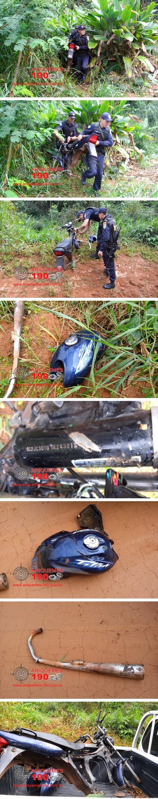 Na manhã desta segunda-feira, 11/05 por volta das 8h00m, a Polícia Militar foi acionada a comparecer no Travessão B-40, à 6 Km da BR-364, pois segundo informações no local havia uma moto depenada. Chegando no local os Militares entraram em contato com um agricultor, o qual relatou que estava passando pelo local, quando em dado momento percebeu sinais na estrada que levava a um matagal. Ao se aproximar do matagal os agricultor percebeu uma moto de cor azul depenada, sem motor e sem placa. Ao consultar o chassi da moto, foi constatado que a mesma havia sido furtada dia 07/05. Diante dos fatos os Militares retiraram a carcaça da moto e conduziram a mesma a 1ª Delegacia Geral de Polícia Civil de Ariquemes, onde foi registrado o Boletim de Ocorrência Policial sob n°4023/2015 para a tomada das providências que cabem ao caso.