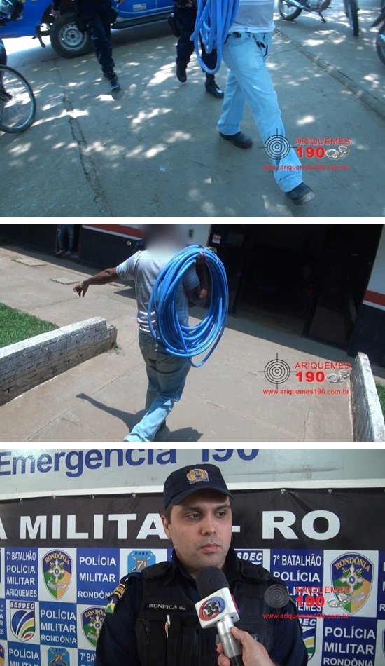 Por determinação da Central de Operações a guarnição da Polícia Militar foi acionada a comparecer por volta das 10h30min desta segunda-feira, (19/10), à Rua Curimatã no Bairro Industrial em Ariquemes, pois no local estaria o solicitante que havia encontrado dois cabos, provavelmente produto de furto, os quais haviam sido recuperados. De imediato a guarnição se deslocou até o local supracitado onde ao chegar entraram em contato com o solicitante, o qual relatou que no dia 17/09 haviam sido furtados da obra onde funcionará o prédio do novo Detran em Ariquemes, dois cabos de 15 metros cada um, conforme relata a ocorrência de n° 2302/2015. Segundo o solicitante os cabos foram encontrados em um estabelecimento comercial localizado no endereço informado. Segundo o solicitante o mesmo se deslocou até o local e com a autorização do proprietário procurou e encontrou os referidos cabos. O solicitante pediu para que o proprietário do local devolvesse os cabos, o qual disse que não poderia devolvê-los, pois segundo o mesmo afirmou que os cabos haviam sido lhe dados. Diante da situação as partes envolvidas foram apresentadas à autoridade policial plantonista na Delegacia de Polícia Civil, onde foi registrado o Boletim de Ocorrência Policial (BOP) sob n° 9333/2015, para que as providências necessárias sejam tomadas.