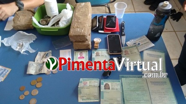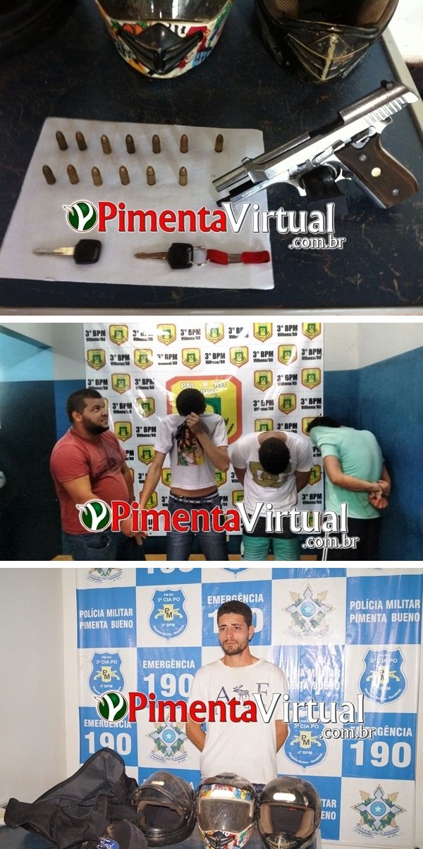 O fato aconteceu por volta das 03h 45min da madrugada desta sexta-feira (06), em frente à indústria de bicicletas Cairu no setor Industrial de Pimenta Bueno – RO. Segundo informações colhidas pela reportagem do site Pimenta Virtual, os vigilantes do local acionaram a Polícia Militar via serviço 190, após bandidos tentarem explodir um caixa eletrônico que fica próximo á empresa. De acordo com a Polícia Militar, os suspeitos usaram certa quantidade de material explosivo, porém não conseguiram levar nada, pois a estrutura do caixa não se rompeu. Rapidamente os policiais se deslocaram ao local e conseguiram avistar os suspeitos ainda nas proximidades. Na fuga, os infratores trocaram tiros com a polícia e ao seguirem adiante, abandonaram as motocicletas e correram em direção a um matagal, onde foram perseguidos pelos policiais, porém não foram alcançados. A Polícia passou então a realizar diligências, onde avistaram um homem em atitude suspeita e com as mesmas características de um dos bandidos. Ao ser abordado, o elemento de imediato confessou sua participação no crime e relatou ser morador da cidade de Vilhena. Já na delegacia, o infrator foi identificado como Pedro Iago Rodrigues Santana de 23 anos de idade, e em depoimento Pedro cita que as motocicletas foram furtadas no dia anterior ao crime e que possivelmente seus comparsas já estariam a caminho de volta à Vilhena. A Polícia Militar de Vilhena foi acionada e com as informações repassadas, conseguiram chegaram ao restante da quadrilha em uma casa do bairro Jardim Eldorado. Lá foram presos, Liam Alves de Andrade, de 22 anos, Maciel Fernandes Claudio, de 28 anos, Jhonatan Lucianco, de 26 anos, três menores e uma mulher que ainda não teve o nome revelado. Na residência dos acusados, os policiais encontraram cerca de 2,5 kg de droga tipo “maconha”, uma máscara e roupas usadas pela quadrilha na ação criminosa. Diante dos fatos, todos os infratores receberam voz de prisão e posteriormente foram encaminhados para Delegacia de Polícia Civil de Vilhena, onde ficaram à disposição da justiça.