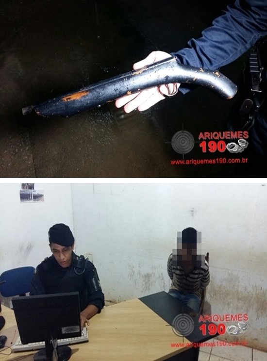 Por volta das 23 horas de quarta-feira, (13/01), os Policiais Militares da Força Tática: Vinícius, Damaren, F. Simões e Françoir, comandados pelo Cabo Dultra, retornavam da cidade de Monte Negro pela RO-421, sendo que na 10ª Rua do Setor 01 em Ariquemes, três marginais haviam roubado aparelhos celulares e uma motoneta da marca Honda, modelo Biz de cor preta, placa NBG-3063 de três garotas de 19 anos que estavam em duas motonetas, sendo uma a referida Biz roubada. No momento em as guarnições estavam próximas à ponte sobre o Rio Jamari, avistaram dois elementos em atitude suspeita em duas motos, sendo a Biz roubada e uma Honda CG de cor preta. Quando os Policiais se aproximaram e mandaram os suspeitos estacionarem os veículos, os mesmos desobedeceram a ordem de parada e iniciaram fuga sentido a Ariquemes. Próximos a uma máquina de arroz os elementos se separaram, sendo que um deles se desequilibrou e parou a moto, iniciando fuga a pé. Ao ser alcançado o meliante reagiu e atacou a guarnição com socos e chutes e palavras de baixo calão, mas foi dominado e algemado. O outro elemento adentrou em um desvio que dá acesso ao Bairro Mutirão, sendo acompanhado por outra guarnição, momento em que entrou em outro desvio seguindo em direção à Vila do Sossego, não sendo mais possível acompanhar o marginal com a viatura, pois o desvio é muito estreito e ali só trafegam veículos do tipo motocicleta. No trajeto da fuga do elemento de 17 anos detido, os PMs localizaram uma arma de fogo do tipo Garrucha, provavelmente utilizada para efetuar o roubo da motoneta. O sujeito disse aos Policiais que não tinha participação no roubo da Biz, que somente conduziu o veículo para um amigo, fornecendo o endereço de um elemento que poderia confirmar a informação. As guarnições então se dirigiram a Rua Dom Pedro II no Bairro Monte Cristo, onde foi localizado o indivíduo E.L.G; que negou conhecer o menor, mas afirmou que horas antes alguns amigos estiveram na residência acertando os detalhes para a realização do roubo e que saíram do local utilizando uma motoneta Pop de cor preta e uma moto CG também de cor preta. Mediante os fatos o menor e a motoneta Biz foram encaminhados a Delegacia Especializada no Atendimento a Mulher, onde foi registrada a ocorrência nº 065/16, para as devidas providências serem encaminhadas.