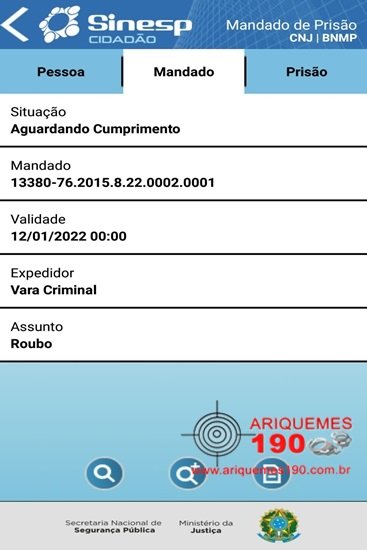 Por volta da uma hora da manhã de domingo, (24/01), os Policiais Militares: Novelli e Máisson realizavam patrulhamento de rotina pelo Setor 04 em Ariquemes, quando avistaram três elementos em atitude suspeita. Os elementos foram abordados e ao realizar consulta nominal através da Central de Operações aos suspeitos, foi constatado um Mandado de Prisão contra Elton Caetano de Paula, de 19 anos, conforme Mandado de Prisão nº 13380-76.2015.8.22.0002.0001, expedido pela 3ª Vara Criminal da Comarca de Ariquemes, assinada pelo Dr. Muhammad Hijazi Zaglout. O Mandado em questão refere-se a um crime de Roubo praticado por Elton, o qual já foi julgado pelo Judiciário transitado em julgado, ou seja, sua condenação é definitiva. O jovem não ofereceu resistência e foi encaminhado para a Delegacia Geral de Polícia Civil, onde foi registrada a ocorrência nº 758/16, para conhecimento da autoridade policial.