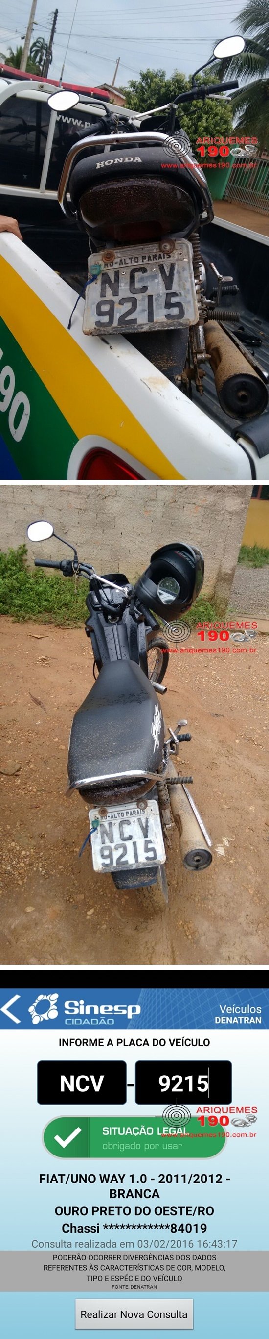 Por volta das 14h30m desta quarta-feira, 03/02, a guarnição da Polícia Militar composta pelo Sargento Carlos e Soldado Nixon, realizava patrulhamento pela Rua Jamari em Alto Paraíso, quando em dado momento os Militares avistaram uma motoneta da marca Honda, modelo Pop de cor preta estacionada, de forma a levantar suspeitas. Ao realizar a consulta veicular ao Sistema Nacional de Informações de Segurança Pública (SINESP) os Militares constataram que a placa que estava na motoneta pertencia a um carro da marca Fiat, modelo Uno. Ao entrar em contato com o proprietário do veículo, a guarnição constatou que o mesmo possuía 17 anos de idade e ao ser indagado sobre o veículo, este informou que havia comprado a motoneta de um pedreiro. Diante da constatação da adulteração o adolescente e o veículo foram conduzidos à Delegacia de Polícia Civil de Ariquemes, onde foi registrado o Boletim de Ocorrência Policial (BOP) sob n°1137/2016, para a tomada das providências que o caso requer.