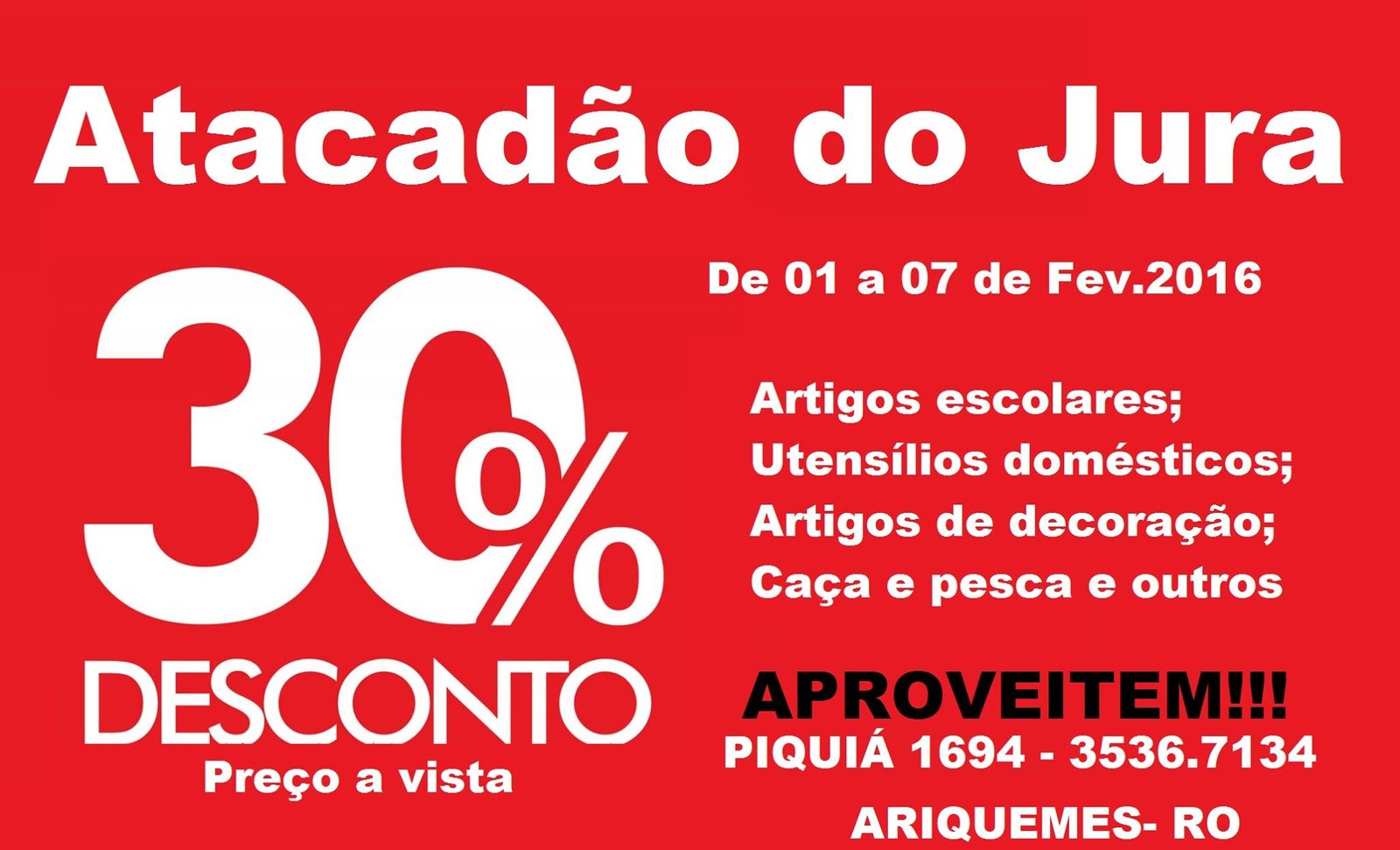 ARIQUEMES: Não perca a grande promoção de 30% de desconto em todo estoque no Atacadão do Jura