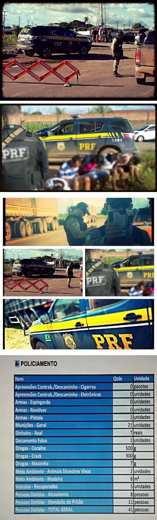 Durante o período os policiais fiscalizaram infrações de trânsito, porte ilegal de armas, de drogas ilícitas, o uso de bebidas alcoólicas pelos condutores de veículos e verificaram o comportamento dos motoristas durante o deslocamento. Foram fiscalizados 7.484 veículos e 9.767 pessoas, destas 1075 condutores foram autuados por irregularidades, 151 documentos retidos, 40 CNHs recolhidas, 1 CNH falsa apreendida, 70 veículos foram recolhidos e 177 veículos foram flagrados fazendo ultrapassagem indevidas e 883 trafegando com velocidade acima do permitida para o local. 2950 motoristas realizaram o teste do etílico, sendo 33 autuados e 8 presos por dirigir sob o efeito de álcool.