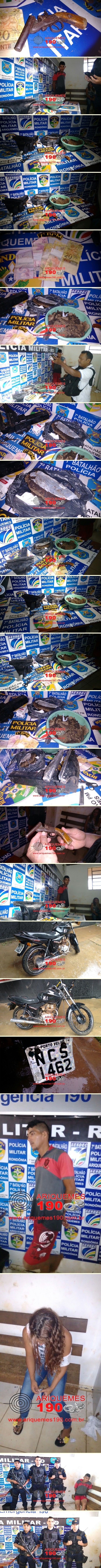 Na manhã deste domingo, 14/02 por volta das 11h20m, a guarnição da Polícia Militar CPL 648 composta pelos Policiais Soldados: Paulo César, Dias e Odenilson, com apoio dos Pms Machula, Ciqueira e Baroso, realizavam patrulhamento de rotina no Bairro Apoio Social em Ariquemes, quando avistou o então ainda suspeito Diemerson Andrade de Castro, 22 anos, saindo das dependências do Parque Botânico através de um buraco existente no muro, levantando suspeitas e deu voz de abordagem, momento em que foi avistado pelos Policiais em suas mão uma arma de fogo tipo garrucha calibre .22 de cor preta, cabo de madeira, marca Rossi. De imediato o agente largou a arma e tentou se evadir, contudo os Policiais foram mais ágeis e detiveram o meliante. Ao ser realizada revista pessoal, mais nada de ilícito com o sujeito foi encontrado, porém ao ser questionado sobre seus documentos pessoais, o mesmo informou que residia em Machadinho do Oeste e que estaria na casa de sua mãe que reside no Bairro Jardim das Pedras. Ao ser questionada, a mãe do infrator desmentiu a versão apresentada pelo infrator e informou aos Policiais que o agente residia no Bairro Apoio Social, Rua Rio Crespo, para onde foi feito deslocamento com apoio das demais guarnições Bravo e Charlie. Ali chegando os Policiais foram recebidos pela amásia de Diemerson, Geicielle da Silva Souza, 18 anos, a qual autorizou a entrada dos Policiais na residência. Ao adentrar na casa os Policiais já sentiram forte odor característico de substância entorpecente e já de cara visualizou em cima da mesa algumas porções da droga aparentando ser Maconha. Ao realizar revista na casa foi encontrado em uma das gavetas da cozinha um tablete da mesma substância e dentro do fogão em uma vasilha mais porções da substância. Além da droga também foi encontrada uma morsa n° 08 (tipo de torno) que era utilizada para prensar a droga. Ao ser questionada, Geicielle afirmou não ter conhecimento da droga, mesmo tendo várias porções em cima de sua mesa. Também foi encontrada em sua posse a quantia de R$ 75,00 em dinheiro miúdo proveniente da venda da droga. Foi encontrada na residência uma motocicleta marca Honda de cor preta, placa NCS-1462 de Porto Velho/RO, a qual Geicielle disse ser de um amigo, mas Diemerson a desmentiu afirmando que era de sua propriedade e que teria adquirido em Alto Paraíso pela quantia de R$ 500,00. Há suspeitas que esta motocicleta tenha sido utilizada para o cometimento de vários roubos nos últimos dias no município de Ariquemes devido suas características serem semelhantes às repassadas pelas vítimas dos crimes. Mediante aos fatos a droga, que totalizou 1,7Kg, juntamente com a motocicleta, a arma, o dinheiro e os dois infratores foram encaminhados à Delegacia Geral de Polícia Civil de Ariquemes, onde foram apresentados à autoridade plantonista para registro da Ocorrência n° 1458/2016, onde as providências necessárias foram tomadas pela autoridade policial.