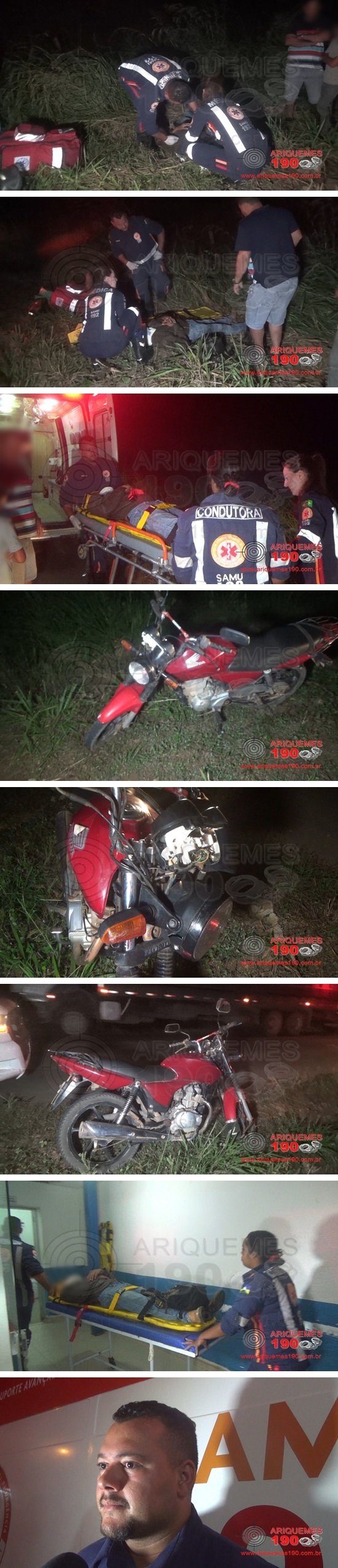 Na noite deste domingo, 14/02, a equipe de socorro do Serviço de Atendimento Móvel de Urgência (SAMU) foi acionada a comparecer na Linha C-65 na Zona Rural de Ariquemes, pois segundo informações no local havia acontecido um acidente de trânsito. De imediato os Militares se deslocaram ao endereço do acidente, onde ali chegando se depararam com um motociclista caído no meio da estrada reclamando de fortes dores no braço direito. Utilizando de um colar cervical e de uma tala a coluna vertebral e o braço da vítima foram imobilizados. Uma testemunha relatou à equipe de reportagens do Canal 35 e Site Ariquemes190 que a vítima estava transitando na Linha, quando em dado momento um agricultor, morador da linha C-70, passou pela vítima e buzinou. Alguns metros depois a testemunha se deparou com a vítima embaixo de sua motocicleta da marca Honda, modelo Bros de cor vermelha, onde de imediato acionou o SAMU para socorrer a vítima. Após ser imobilizada a vítima foi prancheada e colocada na ambulância para ser conduzida ao Pronto Socorro do Hospital Regional de Ariquemes, onde recebeu cuidados médicos especializados.