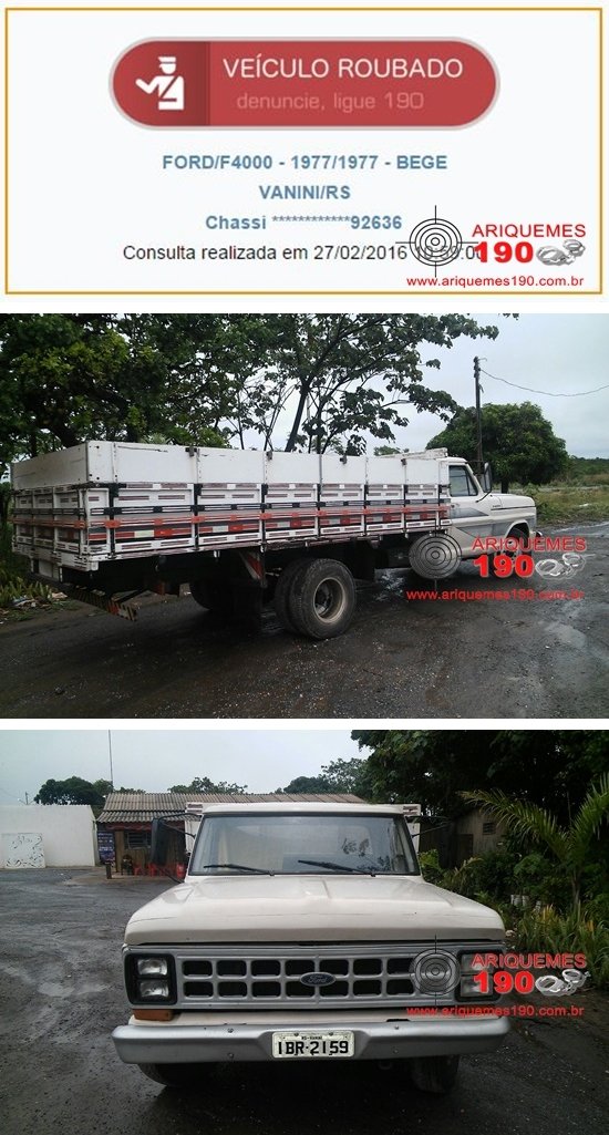 Durante a madrugada do dia 11/02, quinta-feira, foi furtada no Setor 08 de Ariquemes uma caminhonete da marca Ford, modelo F-4000 de cor bege, placa IBR-2159 de Vanini/RS. Os proprietários oferecem recompensa a quem recuperar o veículo furtado. Informações podem ser prestadas telefones 8412-6762 proprietário, 190 - Polícia Militar ou 197 - Polícia Civil.