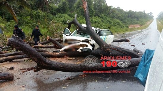 Na madrugada desta terça-feira, 01/03 por volta das 3h00m, a guarnição da Polícia Militar foi acionada a comparecer na RO-257, Km-62 sentido ao Município de Machadinho do Oeste, pois segundo informações no local havia acontecido a queda de uma árvore de grande porte na pista. De imediato os Militares se deslocaram ao endereço do acidente, onde ao chegar se depararam com as equipes do Serviço de Atendimento Móvel de Urgência prestando atendimento às vítimas e o Corpo de Bombeiros retirando os galhos de cima dos veículos. O condutor do veículo da marca Fiat, modelo Fiorino de cor branco relatou que durante a madrugada chovia muito e devido à escuridão não foi possível visualizar a árvore no meio da via, acontecendo à colisão. Devido o impacto as portas do veículo ficaram obstruídas com os galhos e o condutor, duas mulheres e uma criança ficaram presos por alguns minutos. Algum tempo depois o homem conseguiu sair do carro e retirar as outras vítimas. Ao perceber que vinha um carro em sentido contrário, a vítima tentou acenar para avisar, contudo o condutor do taxi não percebeu a árvore a também colidiu. Felizmente ninguém ficou gravemente ferido, contudo com o impacto da colisão o condutor do Fiorinho cortou o joelho, onde ao ser socorrido ao Pronto Socorro levou oito pontos. Após horas de trabalho cortando os galhos os Bombeiros conseguiram retirar a árvore de cima dos carros e evitar que outros acidentes acontecessem. Os veículos envolvidos nessa colisão ficaram com a parte frontal destruídos.
