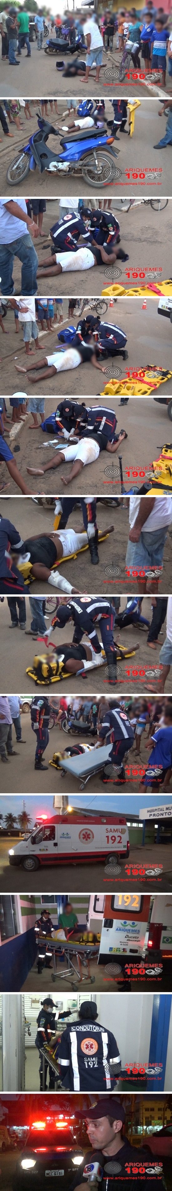 Por volta das 18h30m desta quarta-feira 09/03, a guarnição da Polícia Militar composta pelos Soldados Bruno, Nunes e Ivon foi acionada a comparecer na Av. Tucanos no Setor 09 de Ariquemes, pois segundo informações no local havia acontecido um acidente de trânsito com duas vítimas caídas ao solo. De imediato a guarnição se deslocou ao endereço informado pela Central de Operações, sendo que ao chegar os PM’s se depararam com a equipe do Serviço de Atendimento Móvel de Urgência (SAMU) prestando atendimento a duas mulheres. Ao coletar os dados do que havia acontecido, os Militares foram informados que o condutor do veículo da marca Fiat, modelo Stilo transitava pela 4ª Rua do Setor 09 sentido a um condomínio, enquanto a condutora da motoneta da marca Honda, modelo Biz de cor azul transitava a Avenida sentido a Av. Capitão Silvio. Em dado momento o condutor do carro adentrou a Avenida onde aconteceu a colisão frontal com a motoneta. Devido ao choque, as duas mulheres que estavam na moto caíram ao solo onde sofreram escoriações. A condutora também sofreu uma possível fratura no braço direito que teve que ser imobilizado pelo SAMU utilizando de uma tala. Após as duas vítimas receberem atendimento, ambas foram conduzidas ao Pronto Socorro para receberem cuidados médicos especializados. Diante dos fatos, foi registrado o Boletim de Ocorrência Policial (BOP) sob n°2407/2016 e o Boletim de Ocorrência de Acidente de Trânsito (BOAT) sob n° 90/2016 na 1ª Delegacia Geral de Polícia Civil de Ariquemes, para a tomada das providências que o caso requer.