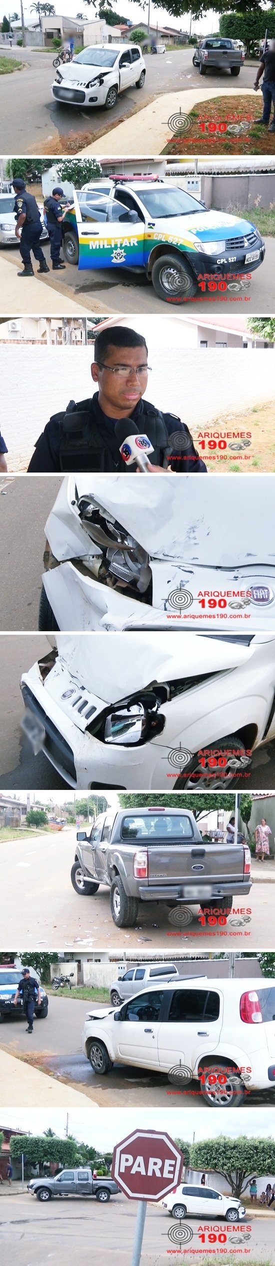 Na tarde desta quarta-feira 10/03, a guarnição da Polícia Militar composta pelo Cabo Monteiro, Soldado Antônio Marcos e Soldado Adonizete foi acionada a comparecer na Avenida Quatro Cachoeiras esquina com a 6ª Rua do Setor 03 de Ariquemes, pois segundo informações recebidas pela Central de Operações neste endereço havia acontecido um acidente de trânsito. De imediato os Militares se deslocaram ao endereço do acidente, onde ao chegar se depararam com dois veículos destruídos. Ao coletar os dados do que havia acontecido, os Militares foram informados que a condutora do veículo da marca Fiat, modelo Uno de cor branco seguia pela Avenida Quatro Cachoeiras, quando em dado momento o condutor da caminhonete da marca Ford, modelo Ranger de cor preta que seguia pela 6ª Rua adentrou a Avenida. Não havendo tempo suficiente para frear, o Uno acabou colidindo com a lateral da caminhonete. Nenhum dos condutores ficou ferido, contudo uma criança que estava no Uno ficou em estado de choque e teve que ser encaminhado ao Pronto Socorro para receber atendimento médico. Ambos os veículo tiveram avarias, contudo o Uno teve o para-choque destruído. Após coletados os dados, os Militares se deslocaram a Delegacia de Polícia Civil de Ariquemes, onde foi registrado o Boletim de Ocorrência Policial (BOP) e o Boletim de Ocorrência de Acidente de Trânsito (BOAT) para a tomada das providências que o caso requer.