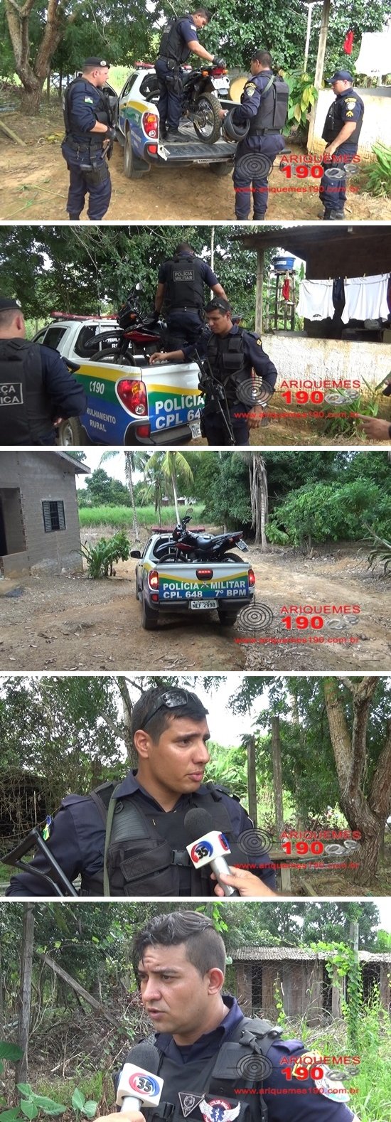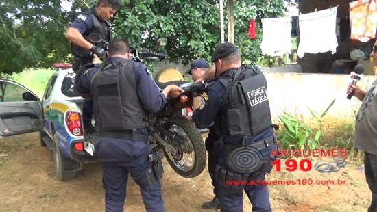 Por volta das 13h15min de sábado (12/03), os Policiais Militares da Patrulha Bravo: Thiago Oliveira, Racanelli e Françoir foram acionados a comparecer em um mercado, localizado na 4ª Rua do Setor 09 de Ariquemes, onde um elemento tinha acabado de roubar o estabelecimento, sendo que na fuga o marginal efetuou vários disparos para o alto, levando a quantia de R$ 300,00 em dinheiro tomando sentido ao Setor 10. Uma testemunha passou para a guarnição o endereço do elemento e a placa da moto, sendo uma Honda, modelo Bros de cor preta. Através da placa os PMs conseguiram o endereço do elemento W.N.M. de 22 anos, sendo o Lote 80 na Rua dos Pardais. No local os Policiais encontraram a referida moto escondida na mata e um cartucho deflagrado de calibre 22 mm. Mediante os fatos a moto foi apresentada a autoridade plantonista na Delegacia de Repressão aos Crimes Contra o Patrimônio, onde foi registrada a ocorrência nº 744/16, para as devidas providências.