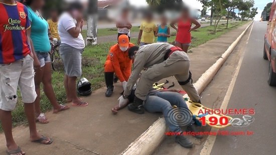 Por volta das 11h00min desta segunda-feira (14/03), uma Equipe do Corpo de Bombeiros foi acionada a comparecer na Av. Jaru no Setor 06 em Ariquemes, onde segundo informações havia ocorrido um acidente de trânsito. Quando chegaram ao local os Militares se depararam com uma mulher caída ao solo apresentando muitas escoriações pelo corpo. Logo os Bombeiros começaram o atendimento pré-hospitalar (APH) na vítima e em seguida a encaminharam para o Hospital Regional de Ariquemes para atendimento médico especializado. A guarnição da Polícia Militar foi acionada e compareceu no local onde estiveram colhendo os dados. Ao levantar informações no local, os policiais foram informados que a motociclista estava transitando pela Av. Jaru, quando em determinado momento ela veio a colidir com dois rapazes que estavam transitando com uma bicicleta, logo após o acidente os jovens se evadiram do local. Os rapazes que se envolveram no acidente foram encontrados pelo Polícia Militar momentos depois. Um dos rapazes sofreu um corte profundo no pé e outro corte em sua perna. Em entrevista concedida ao Canal 35 para o Programa Bronca da Pesada e site Ariquemes 190 o Cabo R. Souza relatou que a motociclista apresentava apenas escoriações leves.