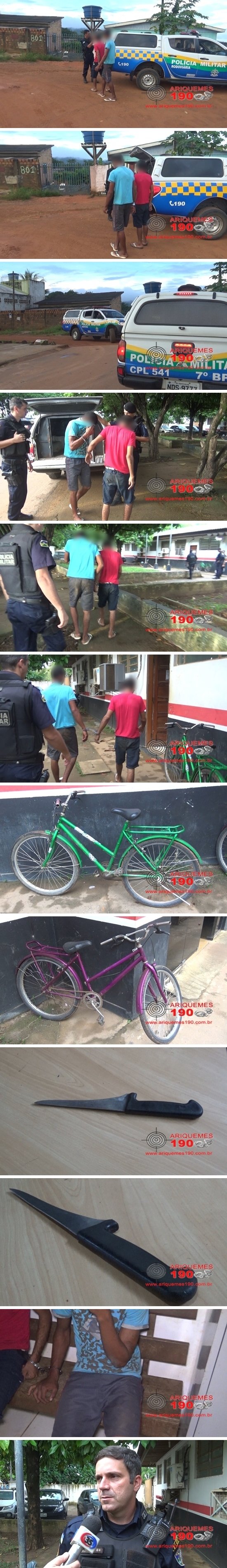 Por volta das 06h30min desta quinta-feira (24/03), a vítima F.V.C. de 19 anos, caminhava pela Avenida Capitão Silvio, quando em frente à subestação localizada ao lado do Quartel da PM, no Setor de Grandes Áreas foi abordada por dois elementos desconhecidos que estavam em duas bicicletas. Um dos bandidos de posse de uma faca anunciou o roubo, sendo que a mulher começou a gritar por socorro, momento em que os elementos assustados se evadiram do local tomando sentido ao Setor 12. Os Policiais Militares: Jaderson e Silva, comandados pelo Cabo Freire foram acionados e durante as buscas localizaram os indivíduos G.E.B. de 29 anos e R.O.S. de 24 anos, na esquina das Ruas Moema com Jacutinga. Os elementos foram conduzidos à Delegacia de Repressão aos Crimes Contra o Patrimônio, onde foi registrada a ocorrência nº 920/16, para as devidas providências.