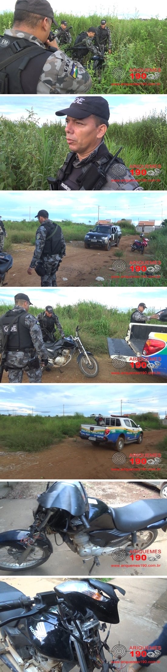 Na tarde deste sábado 26/03, por volta das 17h25m, as guarnições do Grupo de Operações Especiais (GOE) e da Polícia Militar foram acionadas a comparecer na Linha C-65 próximo ao Jardim Feliz Cidade, pois segundo populares no local havia uma moto abandonada em um matagal. Chegando no endereço citado os Militares realizaram buscas até que localizaram a motocicleta da marca Honda, modelo Titan de cor preta placa NDR-1388. Ao realizar a consulta veicular foi constatado que a motocicleta havia sido furtada durante a manhã do mesmo dia conforme o Boletim de Ocorrência Policial (BOP) sob n°954/2016 3ªDP. Diante do exposto, o veículo que estava com muitas avarias foi conduzido a 1ª Delegacia Geral de Polícia Civil de Ariquemes, onde foi registrado o BOP sob n°2941/2016 para que posteriormente a moto seja restituída ao proprietário. Trabalharam nesta ocorrência a guarnição do GOE composta pelo Sargento Prudêncio, Cabo Gomes e Soldado Pinheiro e da PM composta pelo Cabo C. Araújo e Soldados De Paula, Jonatas e Rallilson.