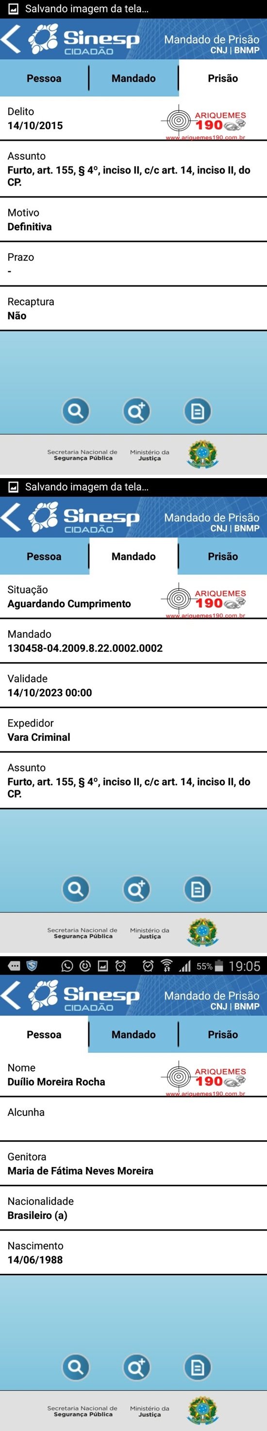 Por volta das 10h30min de segunda-feira (28/03), os Policiais Civis do Serviço de Investigação e Captura (Sevic) se deslocaram a Rua Cuba, no Jardim América, onde foi dado fiel cumprimento ao Mandado de Prisão em desfavor de Duílio Moreira Rocha, de 28 anos, conforme Processo nº 130458-04.2009.8.22.0002, expedido pela 2ª Vara Criminal da Comarca de Ariquemes referente ao crime de furto com pena imposta de 1 ano e 4 meses em regime fechado. O indivíduo foi apresentado na Delegacia Geral, onde foi registrada a ocorrência nº 2973/16, para conhecimento da autoridade competente.