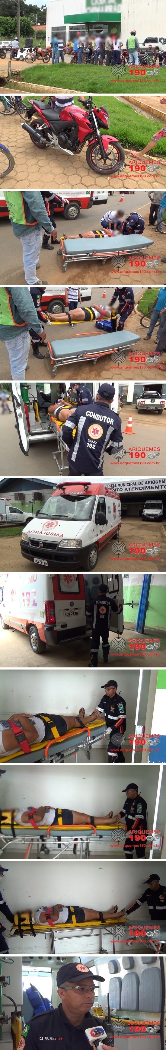 Por volta das 12h30min desta quarta-feira (30/03), a equipe do Serviço de Atendimento Móvel de Urgência (SAMU) foi acionada a comparecer na Av. Capitão Silvio no Setor de Grandes Áreas em Ariquemes, pois segundo informações havia ocorrido um acidente entre uma moto e uma bicicleta. Já no local os socorristas realizaram o atendimento pré-hospitalar (APH) na vítima que em seguida foi encaminhada para o Hospital Regional de Ariquemes para receber atendimento médico especializado. Segundo informações colhidas no local, a mulher transitava de bicicleta na Av. Capitão Silvio, quando em dado momento veio a colidir com uma motocicleta da marca Honda modelo CG 500 da cor vermelha. Em entrevista concedida ao Canal 35 para o Programa Bronca da Pesada e site Ariquemes 190 o Condutor Socorrista Adjalma relatou que a mulher sofreu algumas escoriações e uma suspeita de fratura.