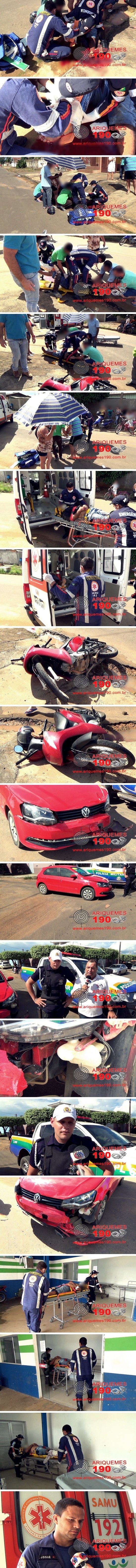 Por volta das 15 horas desta quinta-feira (31/03), a equipe do Serviço de Atendimento Móvel de Urgência (SAMU) foi acionada a comparecer na Avenida Alceu Amoroso Lima com a Rua Graciliano Ramos do Setor 06 em Ariquemes, pois havia ocorrido um acidente de trânsito envolvendo um carro da marca Volkswagen modelo Gol da cor vermelha e uma motoneta da marca Honda modelo Biz da cor vermelha. Já no local os socorristas se depararam com a vítima ao solo apresentando uma fratura exposta no membro inferior no lado direito, imediatamente realizaram o atendimento pré-hospitalar (APH) na vítima e em seguida a encaminharam para o Hospital Regional de Ariquemes para receber cuidados médicos. A guarnição do Patrulha de Trânsito (PTran) esteve no local prestando apoio ao SAMU. Segundo o Boletim de Ocorrência de Acidente de Trânsito (BOAT) sob o nº 121/2016, a condutora do Gol transitava pela 5ª Rua do Setor 06 e ao realizar o cruzamento com a travessa Alceu Amoroso de Lima a mulher não visualizou que vinha uma motoneta, momento em que ocorreu uma colisão transversal. Em entrevista concedida ao Canal 35 para o Programa Bronca da Pesada e site Ariquemes 190 o Condutor Socorrista Josué relatou que possivelmente a vítima será encaminhada para o Hospital de Porto Velho devido à gravidade dos seus ferimentos.