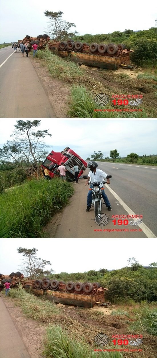 Na manhã desta quarta-feira 06/04, uma carreta da marca Scania de cor vermelha seguia pela BR-364, quando próximo a entrada de Presidente Médici por um descuido o condutor perdeu o controle da direção do veículo e tombou. A carreta estava carregada de soja e felizmente o condutor não ficou ferido apenas com danos materiais.