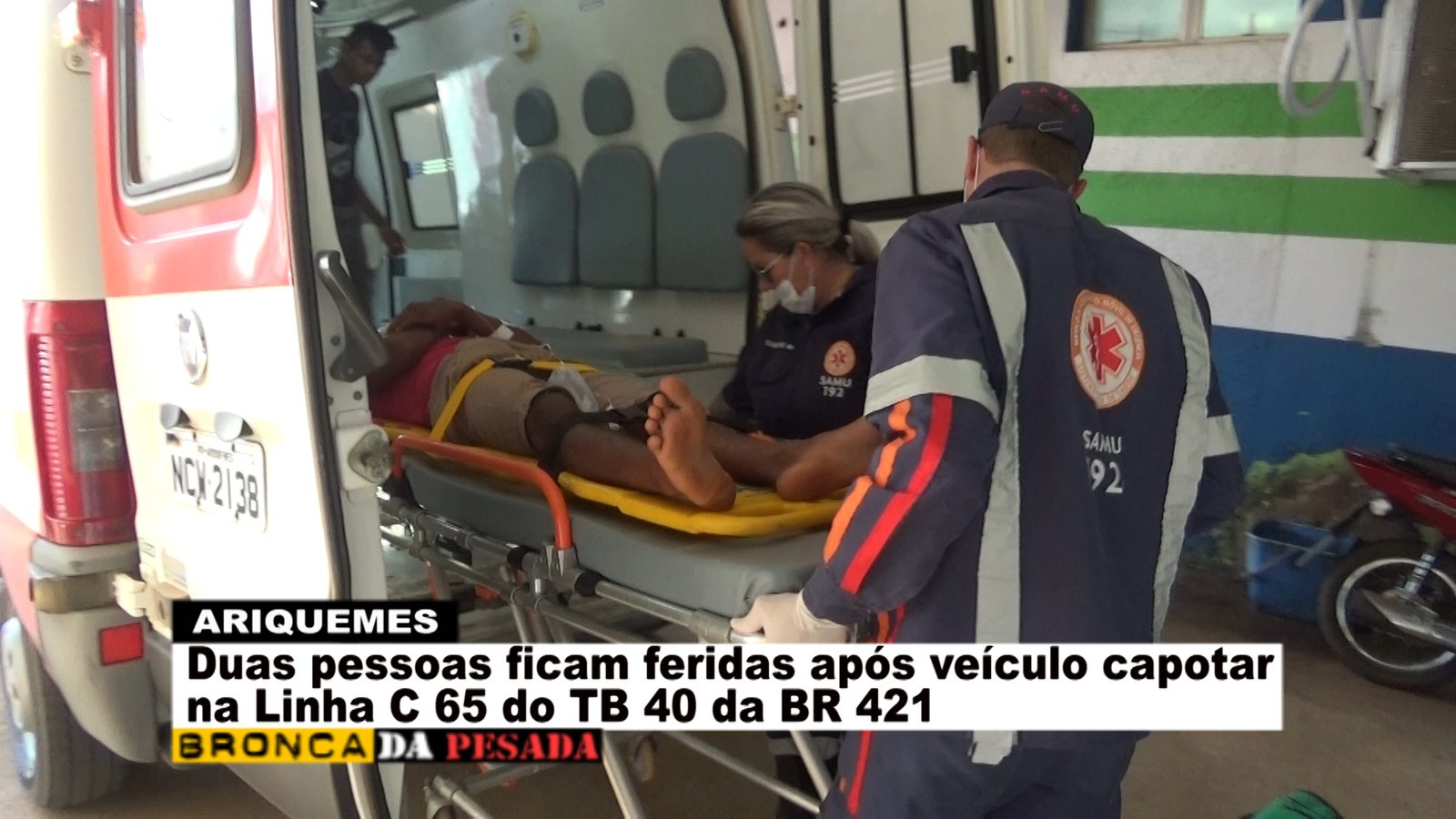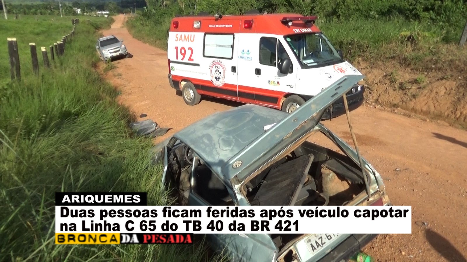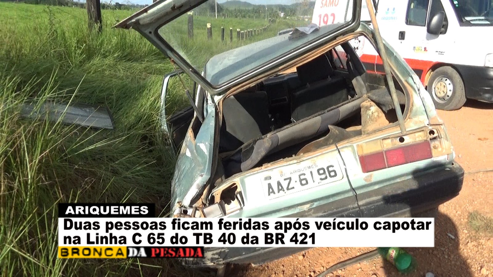 Na tarde deste sábado (09/04), a equipe do Serviço de Atendimento Móvel de Urgência (SAMU) foi acionada a comparecer na Linha C-65 no travessão B-40 da BR-421, pois segundo informações havia ocorrido um capotamento. Já no local os socorristas se depararam com uma das vítimas ao solo se queixando de dor na região da coluna e a outra vítima que já se encontrava em pé apresentando apenas escoriações leves. Logo os socorristas do SAMU começaram o procedimento de primeiros socorros à vítima que estava caída ao solo. Segundo uma das vítimas, esta relatou que o veículo da marca Gol modelo antigo veio a capotar após a barra de direção quebrar e o freio não funcionar no momento. Após o atendimento pré-hospitalar em um dos rapazes envolvidos no acidente, este foi encaminhado para o Hospital Regional de Ariquemes para receber cuidado médico especializado. Em entrevista concedida ao Canal 35 para o Programa Bronca da Pesada e site Ariquemes 190 a técnica de enfermagem Simone relatou que a vítima possivelmente sofreu uma fratura na escápula que esta localizada na parte superior das costas.