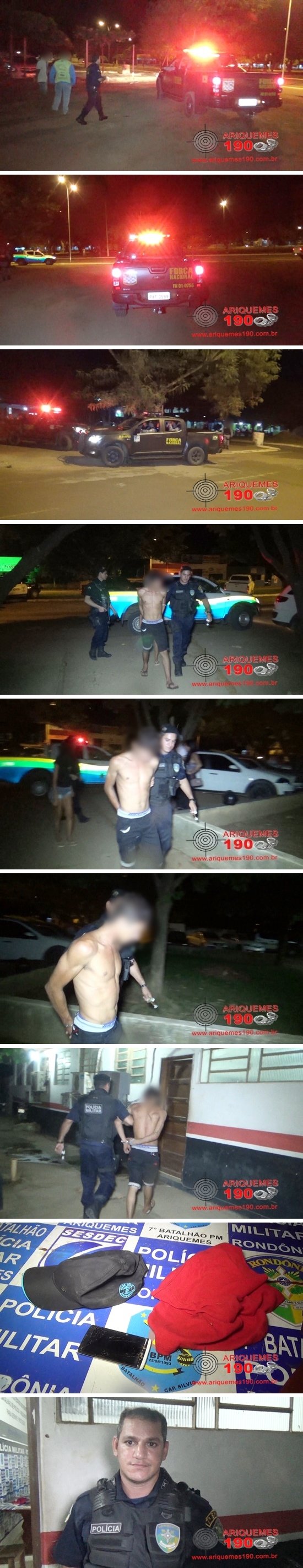 Por volta das 21h15min de domingo (10/04), a vítima D.P.S,F. de 19 anos, estava caminhando pela Praça dos Três Poderes, localizada entre a rodoviária e a Câmara de Vereadores na Avenida Jamari, quando um elementos desconhecido pediu dois reais, ao doar o referido dinheiro, o marginal anunciou o roubo e pegou o aparelho celular do rapaz, em seguida o meliante se evadiu do local tomando rumo ignorado. Populares que perceberam a ação acionaram os Policiais Militares: Moisés, Cleiton Barbosa e Rafael Fonseca que ao chegarem ao local indicado juntamente com a guarnição da Força Nacional avistaram o marginal puxando uma mulher pelo braço. O elemento foi abordado e se identificou com o nome de um menor idade, sendo que a mulher contou aos PMs que ele a estava obrigando a esconder um celular que havia roubado, pois a guarnição não poderia revistá-la. Por ser menor idade a mãe do sujeito foi chamada e falou aos Policiais que na verdade o indivíduo se chamava I.R.O. de 20 anos e estava usando o nome de um de seus irmãos. A vítima reconheceu o seu aparelho celular, mediante os fatos a ocorrência nº 1094/2016, foi registrada na Delegacia de Repressão aos Crimes Contra o Patrimônio, para as devidas providências.