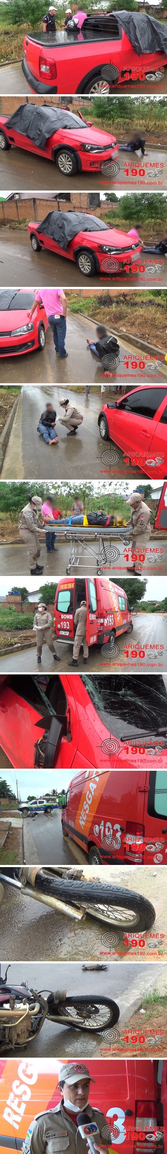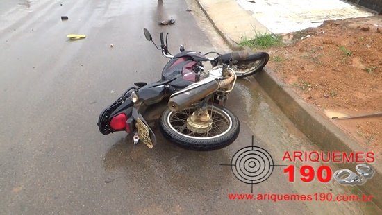 Por volta das 09 horas desta terça-feira (12/04), o condutor do veículo da marca Volkswagen modelo Saveiro da cor vermelha com placa de Porto Velho transitava na Rua Ursa Maior no Bairro Rota do Sol em Ariquemes, quando ao passar pela Rua Canopus veio a colidir com o condutor da motocicleta da marca Honda modelo CG 150 Titan de cor preta. Segundo testemunhas o condutor da motocicleta foi arremessado para cima do parabrisa do carro. De imediato o Corpo de Bombeiros foi acionado juntamente com a Patrulha de Trânsito (PTran) onde momentos depois compareceram no local. A vítima recebeu atendimento pré-hospitalar em seguida foi encaminhada para o Hospital Regional de Ariquemes para receber cuidados médicos especializados. Em entrevista concedida para ao Canal 35 para o Programa Bronca da Pesada a Sargento Neide do Corpo de Bombeiros relatou que a vítima sofreu algumas escoriações e estará passando por avaliação médica para saber sua real situação, pois a mesma se queixava de dores na região da perna e pé.