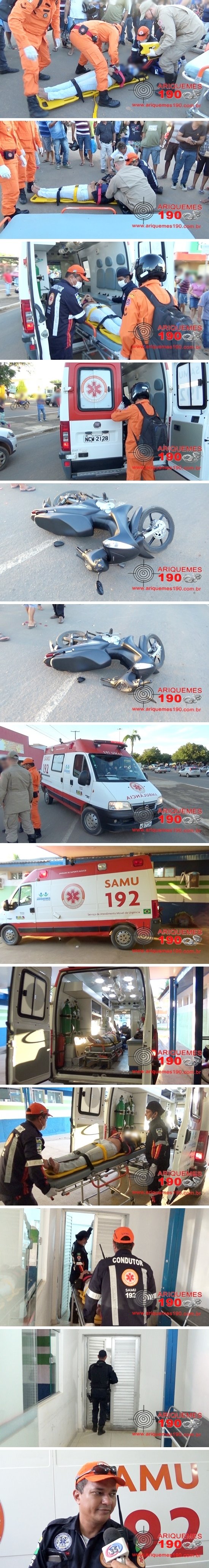 Mais um acidente de trânsito ocorreu no final da tarde desta quarta-feira (13/04), quando ao passar pelo quebra-molas a condutora da motoneta da marca Hond a modelo Biz de cor preta que estava transitando pela Av. Tancredo Neves perdeu o controle da direção do veículo vindo a cair ao solo. De imediato o Corpo de Bombeiros e a equipe do Serviço de Atendimento Móvel de Urgência (SAMU) foram acionados a comparecer no local do acidente. Quando os Bombeiros e os socorristas do SAMU chegaram ao local se depararam com a vítima caída ao solo, logo ambas as equipes em trabalho conjunto realizaram o procedimento de primeiros socorros à vítima. Após o atendimento pré-hospitalar a vítima foi encaminhada ao Hospital Regional de Ariquemes onde ficou sob cuidados médicos especializados. Em entrevista concedida ao Canal 35 para o Programa Bronca Pesada e Site Ariquemes 190 o Condutor Socorrista Washington relatou que a vítima sofreu algumas escoriações e um corte no queixo.