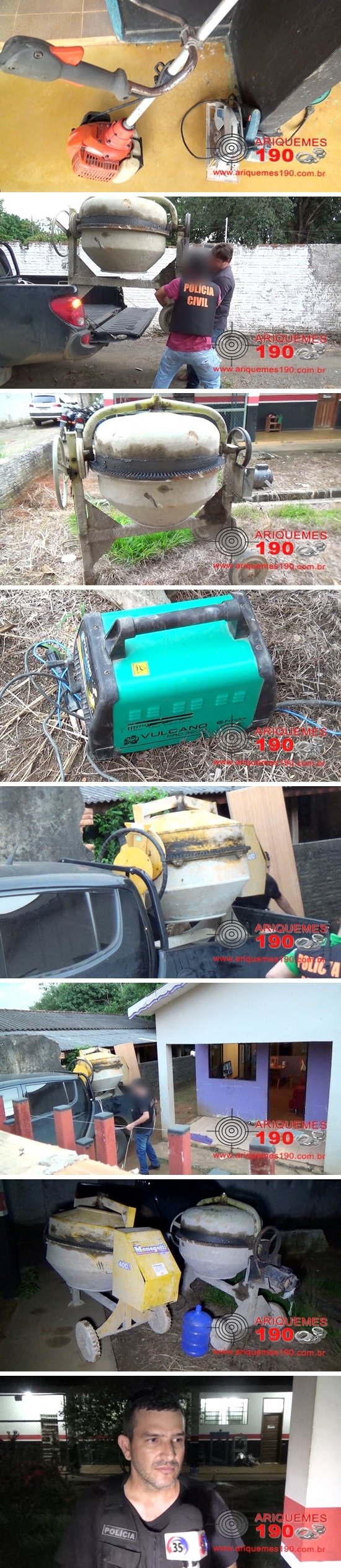 Por volta das 17 horas de quinta-feira (14/04), os Policiais Civis: Ademar, Robson, Tadeu, Aguiar e Mariquison, foram informados através de uma ligação anônima, que em uma residência localizada na 10ª Rua do Setor 09 de cima, havia duas betoneiras e outros objetos que seriam produtos de furto. De posse do endereço a equipe foi averiguar a denúncia e localizou duas betoneiras no quintal da referida residência, onde foi detido o suspeito W.F.G.A. de 21 anos, para maiores esclarecimentos. Os Policiais comunicaram as vítimas J.R. de 37 anos, que registrou a ocorrência nº 3539/16 na Delegacia Geral que prontamente reconheceu a sua betoneira da marca Fisher, a vítima reconheceu também uma máquina de solda da marca Vulcano, uma maquita da marca Bosch e uma porta de madeira. A vítima disse ainda que a outra betoneira da marca Menegotti pertence ao Pedreiro J.R.S. de 42 anos, conforme ocorrência nº 3610/16, registrada na Delegacia Geral. O Mestre de Obras L.S.S. de 51 anos reconheceu uma pá, uma enxada, um arco de serra, um facão, uma extensão de cor preta, um alicate turquesa, uma colher de pedreiro, um rolo de arame, um bebedouro e um galão de água, conforme ocorrência nº 3494 e 3606/16, registradas na Delegacia Geral. Uma roçadeira da marca Husqvarna, modelo 143R-11236R não foi reconhecida por nenhuma das vítimas e a betoneira referente à ocorrência nº 3494/16, não foi recuperada. Mediante os fatos a ocorrência nº 3605/16, foi registrada na Delegacia Geral para as devidas providências.