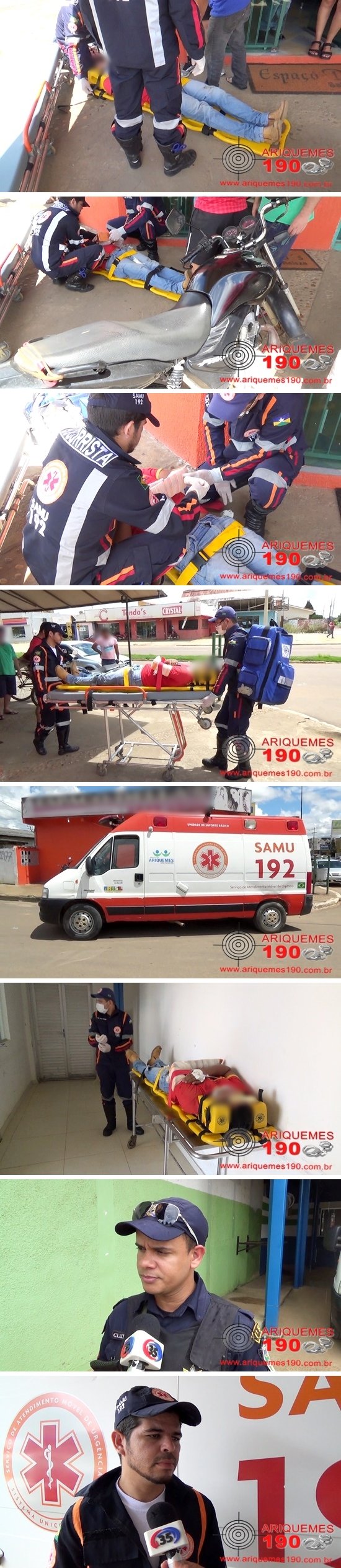 Por volta das 12h00min desta sexta-feira (15/04), a equipe do Serviço de Atendimento Móvel de Urgência (SAMU) foi acionada a comparecer na Av. Canaã esquina com 5ª Rua do Setor 01 em Ariquemes, onde segundo informações havia ocorrido um acidente de trânsito. Já no local os socorristas se depararam com a vítima caída ao solo e de imediato iniciaram o atendimento pré-hospitalar. Segundo testemunhas, o condutor do carro e o condutor da motocicleta da marca Honda modelo CG Fan de cor preta estavam transitando pela Av. Canaã, quando adentraram no mesmo momento na 5ª Rua do Setor 01 ocasionando a colisão lateral dos veículos. Após o procedimento de primeiros socorros, a vítima foi encaminhada o Hospital Regional de Ariquemes para receber tratamentos médicos especializados. Em entrevista concedida ao Canal 35 para o Programa Bronca da Pesada e site Ariquemes 190 o Condutor Socorrista Marquinhos relatou que a vítima no local do acidente se queixava de dores no membro superior esquerdo, a mesma sofreu escoriações na mão e nos dedos. No Hospital a vítima passou por um Raio-X em seu membro superior esquerdo e foi constatado que não havia sofrido fratura.
