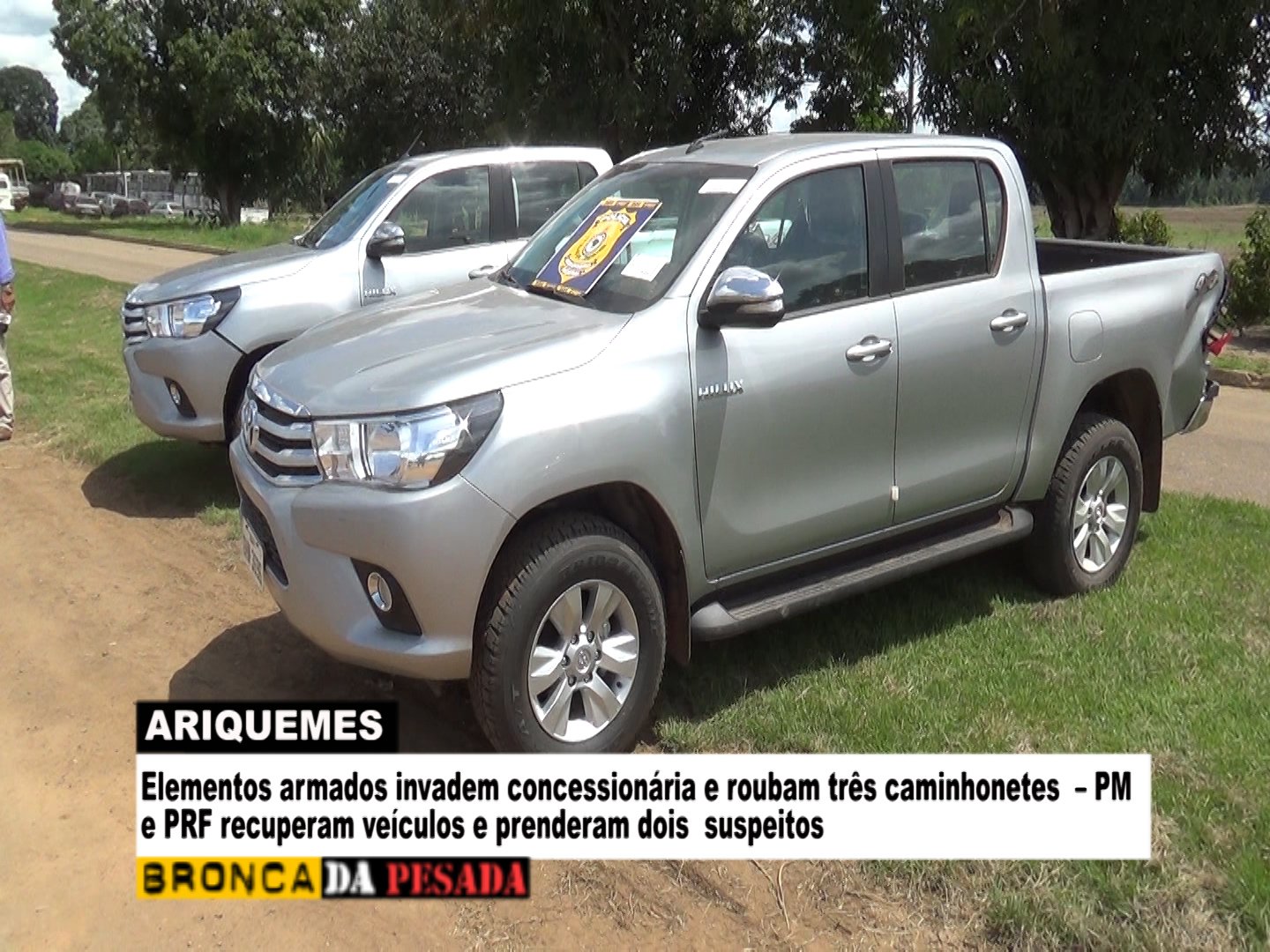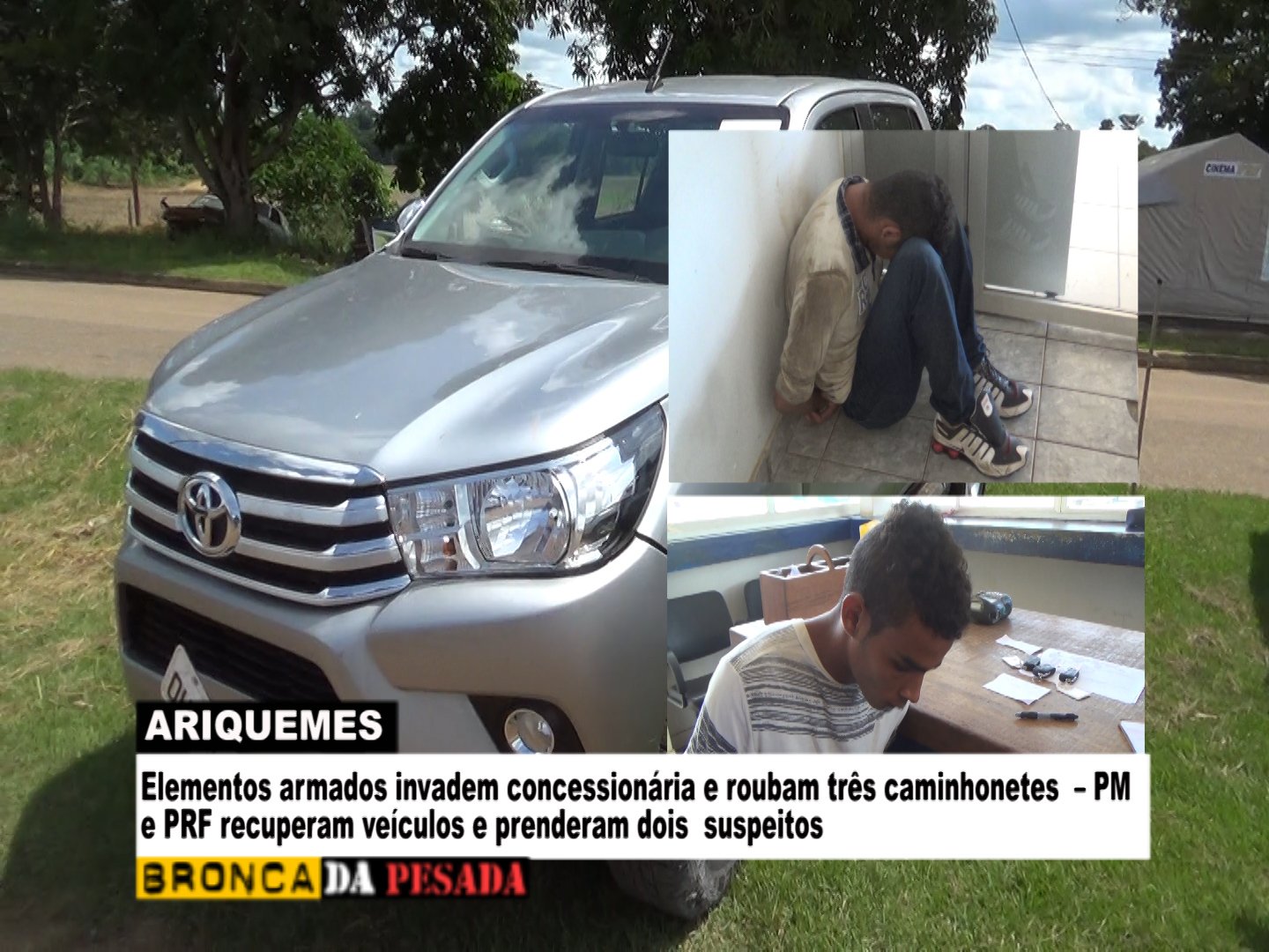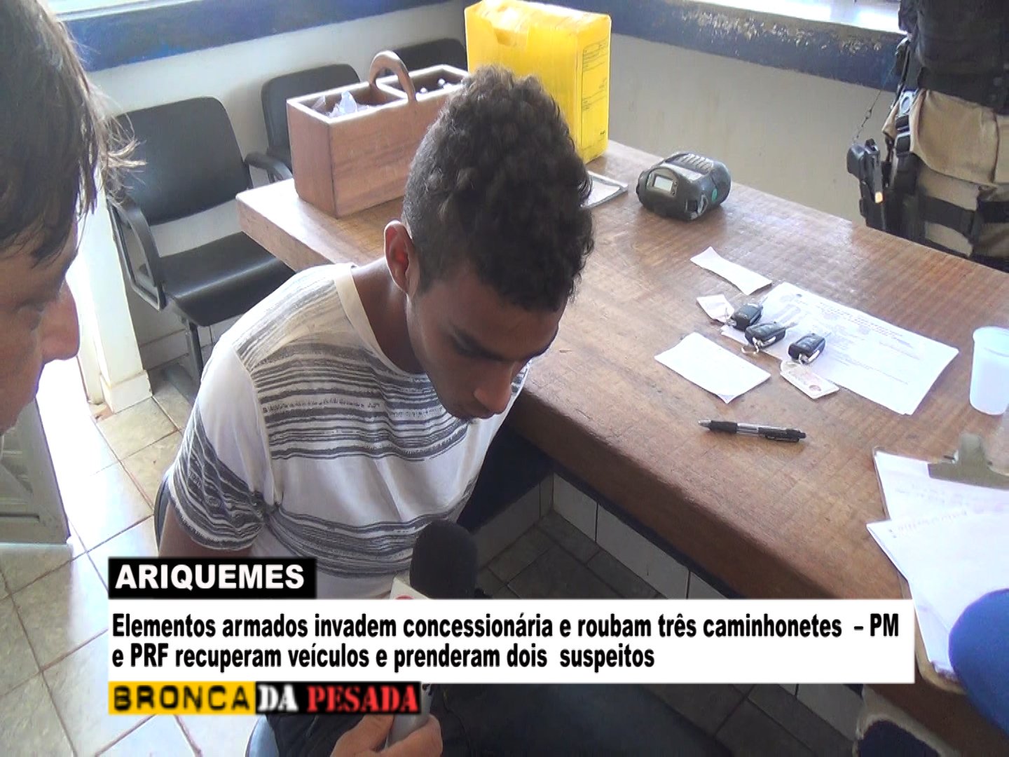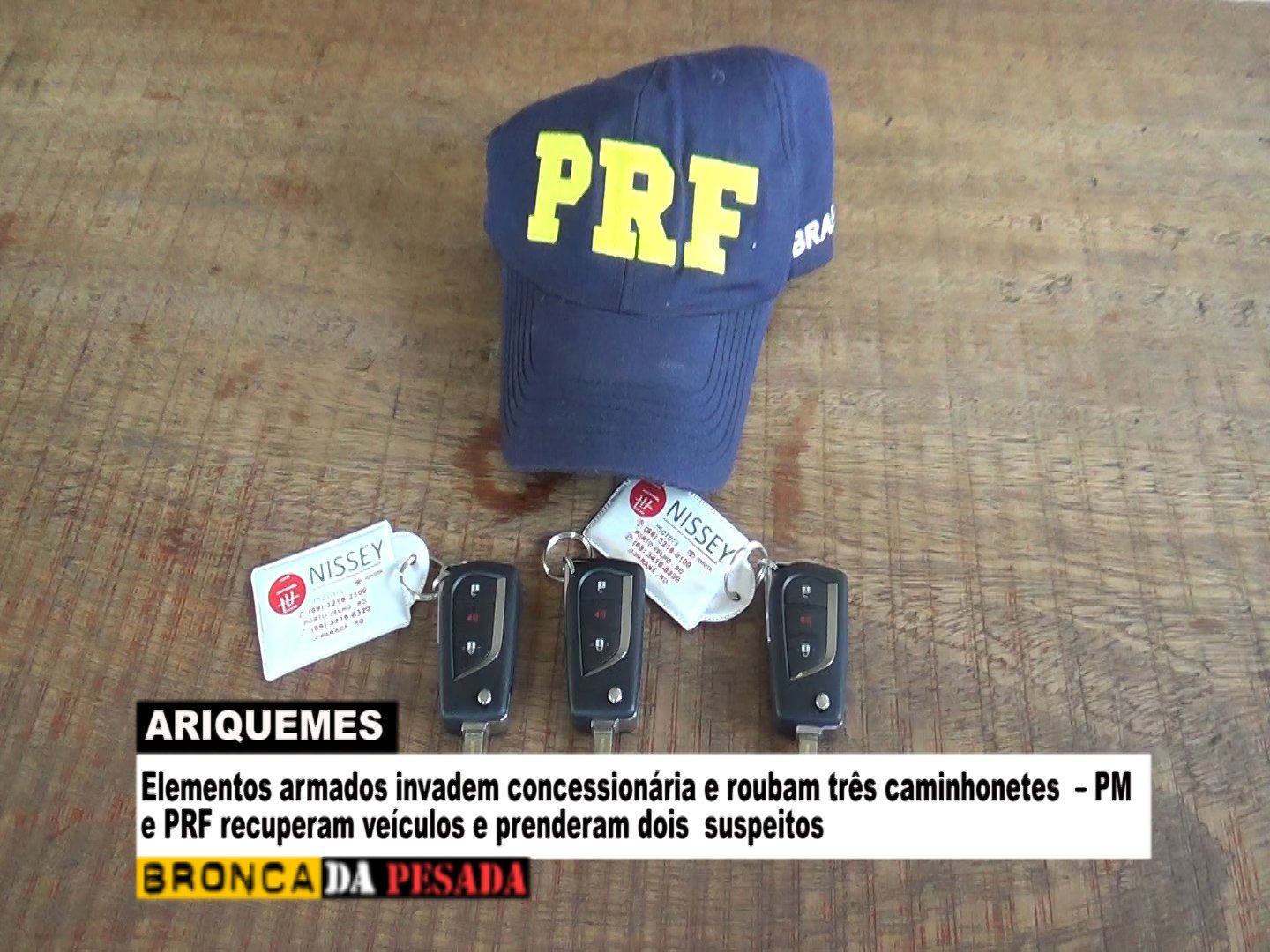 Já eram 6h50m da manhã de domingo, 17/04, quando um funcionário de uma concessionária de veículos foi rendido por três meliantes armados que o amarraram, entraram no pátio da empresa e subtraíram três caminhonetes marca Toyota, modelo Hilux zero km, fugindo em seguida. O fato aconteceu na Br-364, Km-21, onde a concessionária fica localizada, no momento em que o funcionário realizava a limpeza do pátio externo. Segundo relatou o funcionário aos Policiais Rodoviários Federais G. Alves, Maria, Júnior Silva, Alexandrino, K. Rodrigues e L. Basílio, os meliantes retiraram placas de outros veículos e inseriram nos veículos novos, ainda não emplacados, na tentativa de ludibriar a fiscalização. De imediato foram informados os demais postos da PRF ao longo da Br-364, inclusive a Polícia Militar, onde minutos mais tarde foram identificadas duas caminhonetes com as mesmas características passando pelo posto da PRF do município de Itapuã do Oeste, onde foram identificadas as placas roubadas de outros veículos da concessionária. Nesse momento iniciou-se o acompanhamento e ao perceberem que estavam sendo seguidos, os infratores imprimiram alta velocidade, ignorando a ordem de parada, realizando várias ultrapassagens perigosas, quando na altura do Km-646 os veículos acabaram colidindo entre si e saindo de pista. Foram detidos Moisés Silva Lima, 20 anos e Josimar Soares Taveira, 19 anos, os quais foram conduzidos e apresentados na Delegacia de Repressão aos Crimes Contra o Patrimônio em Ariquemes juntamente com os dois veículos. Por volta das 11 horas da manhã, a guarnição da Polícia Militar comandada pelo Cabo Salton, composta pelos Soldados Ribeiro e F. Almeida, foram informados que na Av. Tancredo Neves haveria uma caminhonete abandonada. Ali chegando constataram que tal veículo se tratava do mesmo que havia sido roubado horas antes da concessionária. Sendo assim o veículo também foi encaminhado à Delegacia de Polícia, onde foi registrada a Ocorrência sob n° 1169/2016, para que a autoridade Policial desse prosseguimento aos procedimentos de praxe.