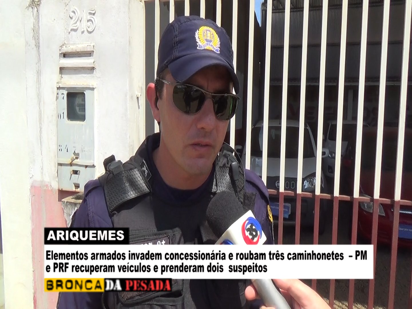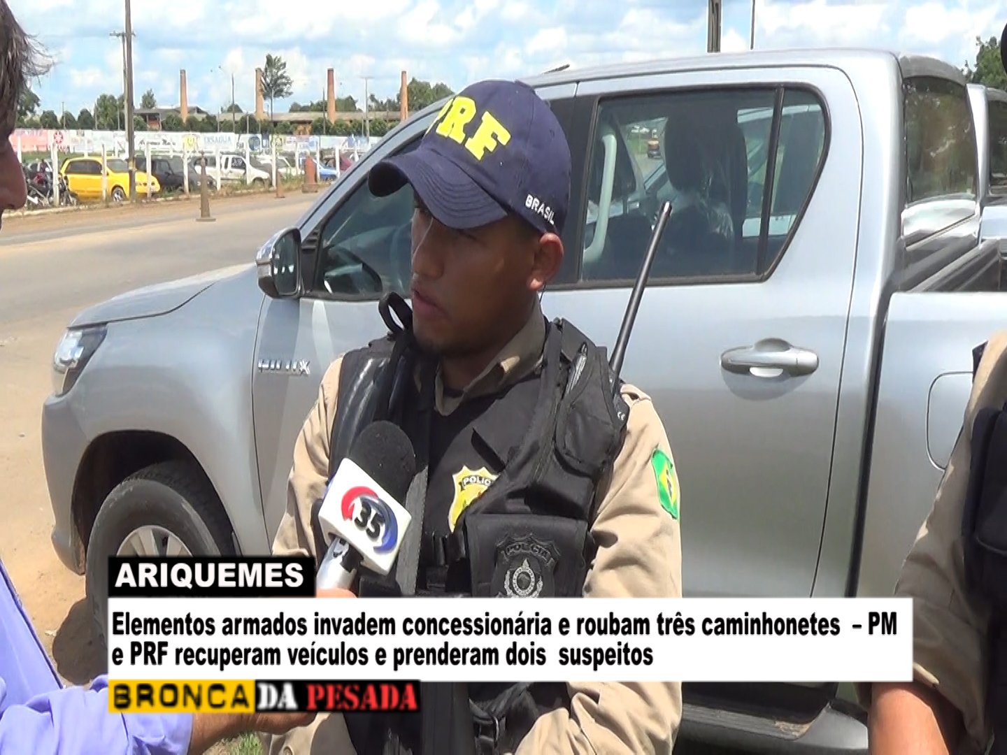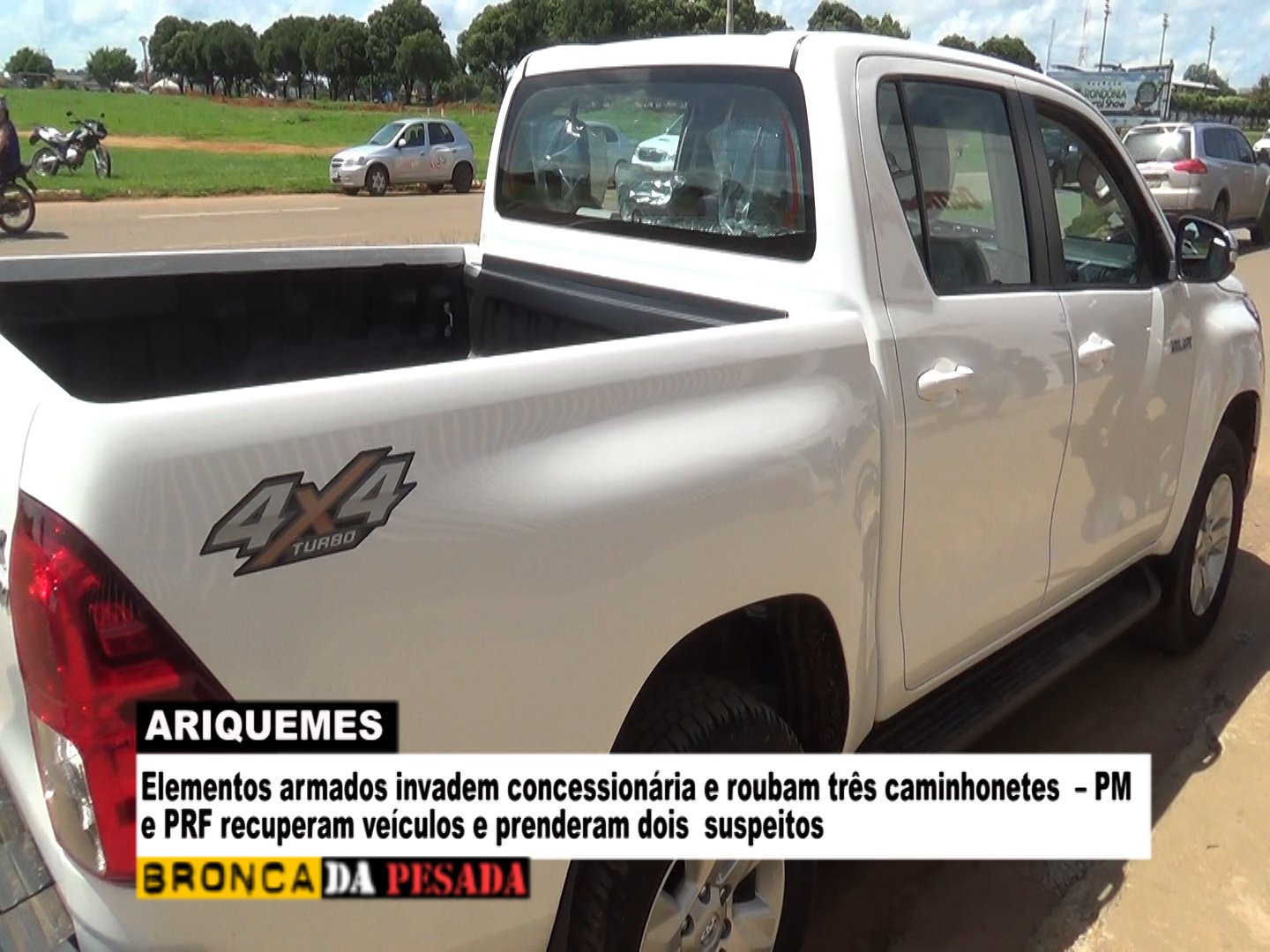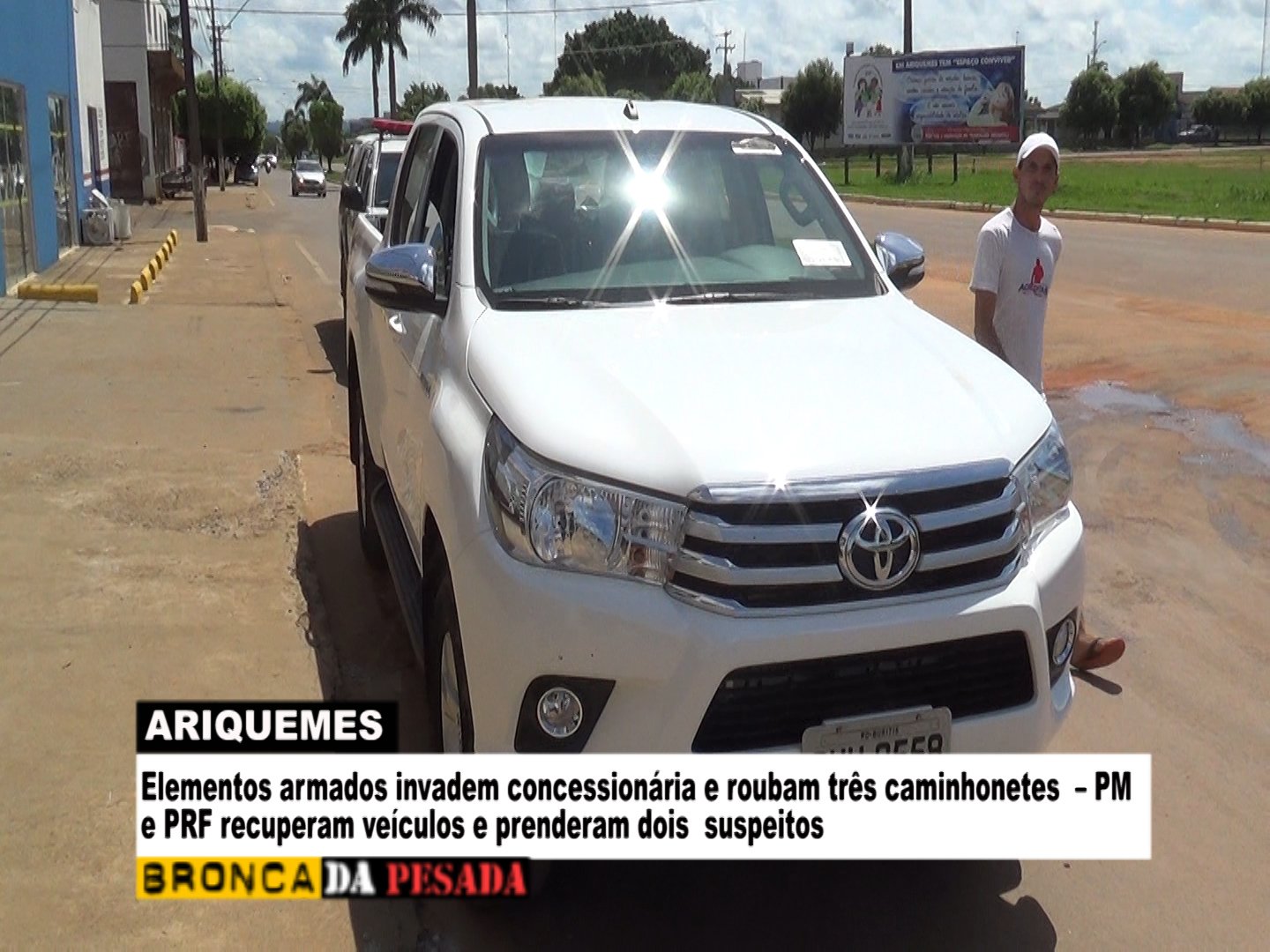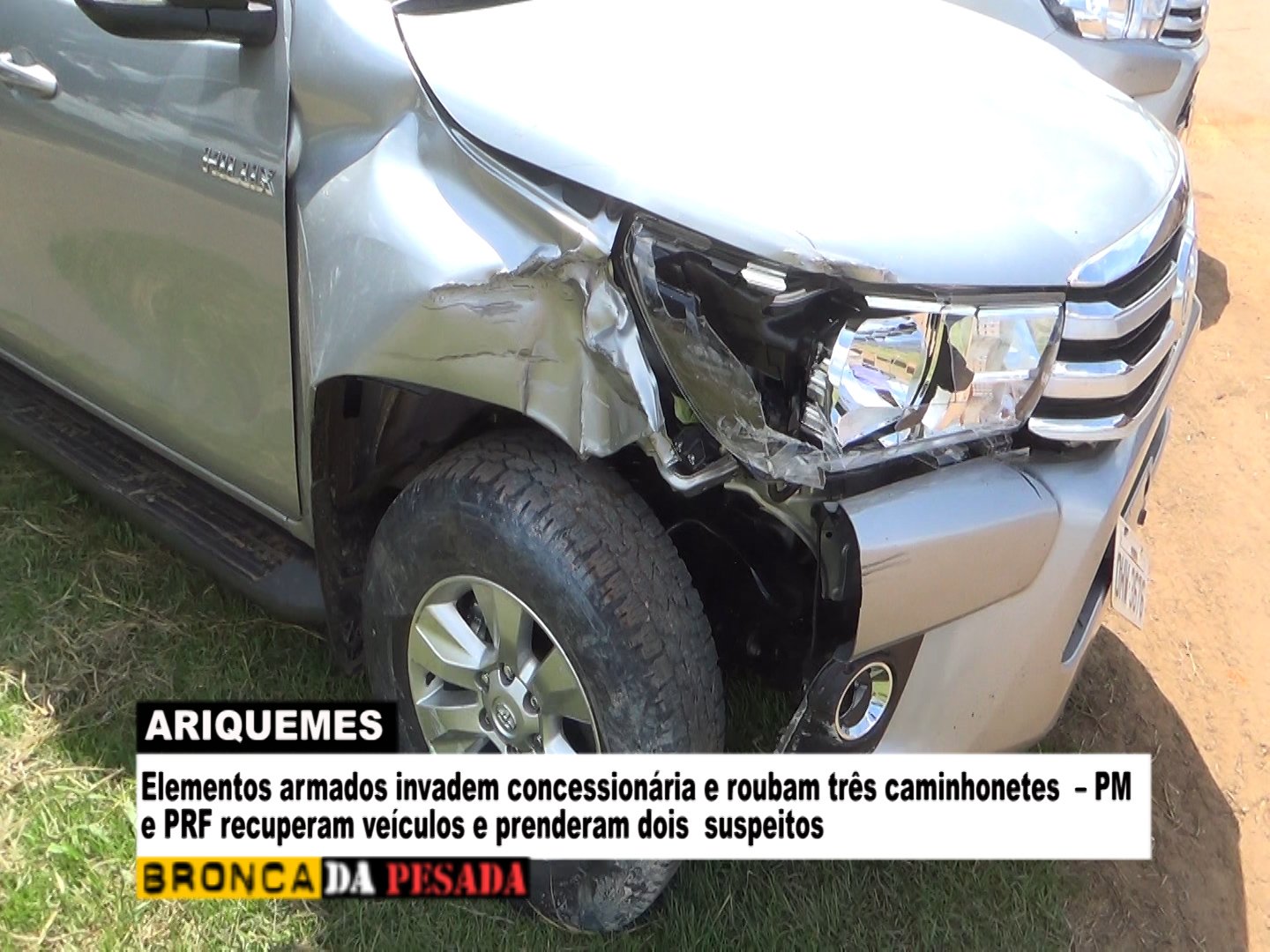 Já eram 6h50m da manhã de domingo, 17/04, quando um funcionário de uma concessionária de veículos foi rendido por três meliantes armados que o amarraram, entraram no pátio da empresa e subtraíram três caminhonetes marca Toyota, modelo Hilux zero km, fugindo em seguida. O fato aconteceu na Br-364, Km-21, onde a concessionária fica localizada, no momento em que o funcionário realizava a limpeza do pátio externo. Segundo relatou o funcionário aos Policiais Rodoviários Federais G. Alves, Maria, Júnior Silva, Alexandrino, K. Rodrigues e L. Basílio, os meliantes retiraram placas de outros veículos e inseriram nos veículos novos, ainda não emplacados, na tentativa de ludibriar a fiscalização. De imediato foram informados os demais postos da PRF ao longo da Br-364, inclusive a Polícia Militar, onde minutos mais tarde foram identificadas duas caminhonetes com as mesmas características passando pelo posto da PRF do município de Itapuã do Oeste, onde foram identificadas as placas roubadas de outros veículos da concessionária. Nesse momento iniciou-se o acompanhamento e ao perceberem que estavam sendo seguidos, os infratores imprimiram alta velocidade, ignorando a ordem de parada, realizando várias ultrapassagens perigosas, quando na altura do Km-646 os veículos acabaram colidindo entre si e saindo de pista. Foram detidos Moisés Silva Lima, 20 anos e Josimar Soares Taveira, 19 anos, os quais foram conduzidos e apresentados na Delegacia de Repressão aos Crimes Contra o Patrimônio em Ariquemes juntamente com os dois veículos. Por volta das 11 horas da manhã, a guarnição da Polícia Militar comandada pelo Cabo Salton, composta pelos Soldados Ribeiro e F. Almeida, foram informados que na Av. Tancredo Neves haveria uma caminhonete abandonada. Ali chegando constataram que tal veículo se tratava do mesmo que havia sido roubado horas antes da concessionária. Sendo assim o veículo também foi encaminhado à Delegacia de Polícia, onde foi registrada a Ocorrência sob n° 1169/2016, para que a autoridade Policial desse prosseguimento aos procedimentos de praxe.
