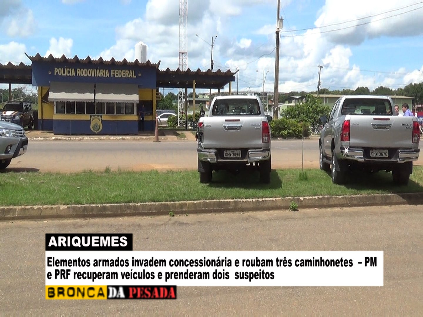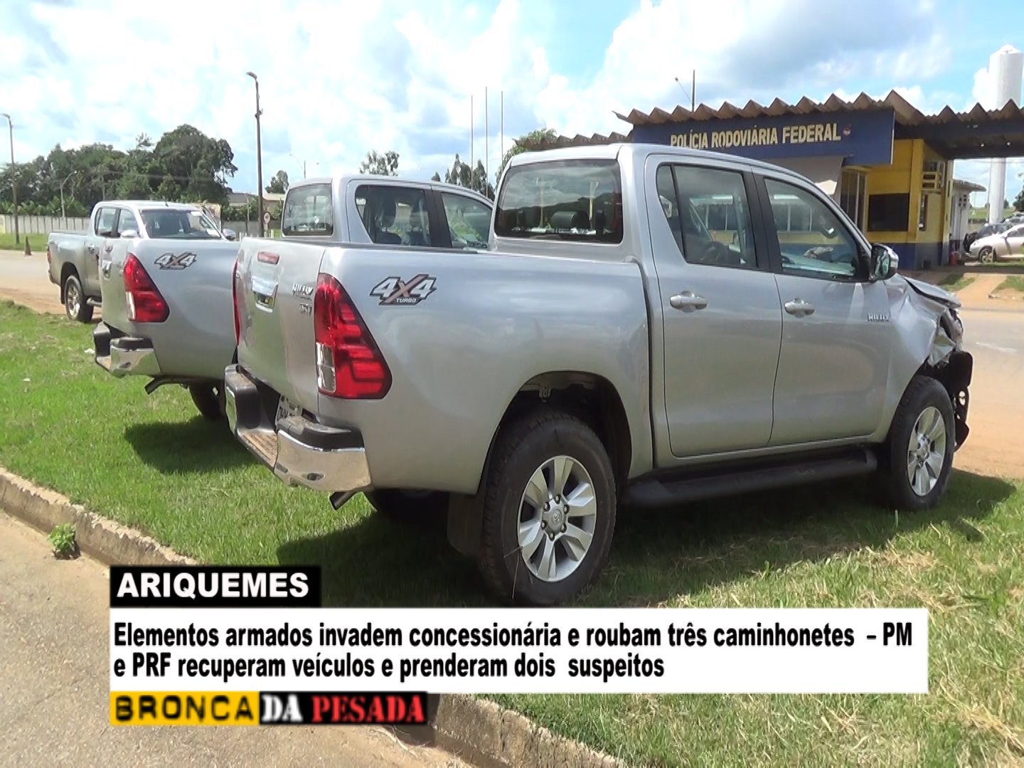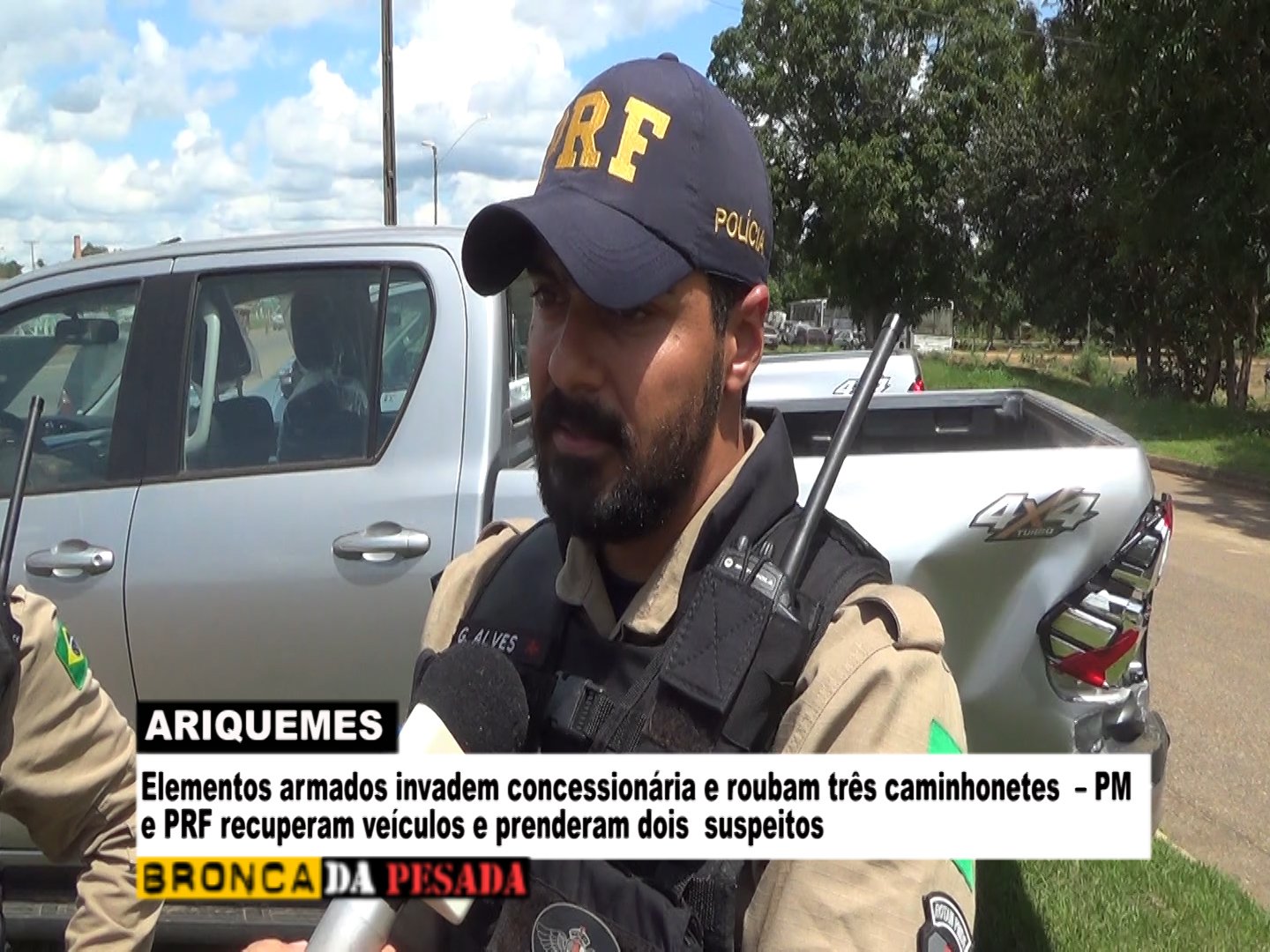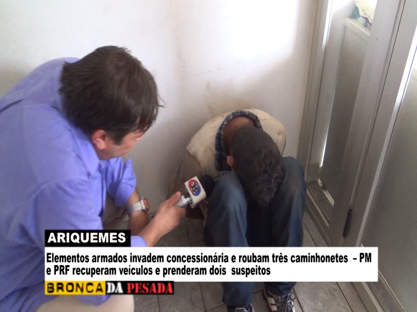 Já eram 6h50m da manhã de domingo, 17/04, quando um funcionário de uma concessionária de veículos foi rendido por três meliantes armados que o amarraram, entraram no pátio da empresa e subtraíram três caminhonetes marca Toyota, modelo Hilux zero km, fugindo em seguida. O fato aconteceu na Br-364, Km-21, onde a concessionária fica localizada, no momento em que o funcionário realizava a limpeza do pátio externo. Segundo relatou o funcionário aos Policiais Rodoviários Federais G. Alves, Maria, Júnior Silva, Alexandrino, K. Rodrigues e L. Basílio, os meliantes retiraram placas de outros veículos e inseriram nos veículos novos, ainda não emplacados, na tentativa de ludibriar a fiscalização. De imediato foram informados os demais postos da PRF ao longo da Br-364, inclusive a Polícia Militar, onde minutos mais tarde foram identificadas duas caminhonetes com as mesmas características passando pelo posto da PRF do município de Itapuã do Oeste, onde foram identificadas as placas roubadas de outros veículos da concessionária. Nesse momento iniciou-se o acompanhamento e ao perceberem que estavam sendo seguidos, os infratores imprimiram alta velocidade, ignorando a ordem de parada, realizando várias ultrapassagens perigosas, quando na altura do Km-646 os veículos acabaram colidindo entre si e saindo de pista. Foram detidos Moisés Silva Lima, 20 anos e Josimar Soares Taveira, 19 anos, os quais foram conduzidos e apresentados na Delegacia de Repressão aos Crimes Contra o Patrimônio em Ariquemes juntamente com os dois veículos. Por volta das 11 horas da manhã, a guarnição da Polícia Militar comandada pelo Cabo Salton, composta pelos Soldados Ribeiro e F. Almeida, foram informados que na Av. Tancredo Neves haveria uma caminhonete abandonada. Ali chegando constataram que tal veículo se tratava do mesmo que havia sido roubado horas antes da concessionária. Sendo assim o veículo também foi encaminhado à Delegacia de Polícia, onde foi registrada a Ocorrência sob n° 1169/2016, para que a autoridade Policial desse prosseguimento aos procedimentos de praxe.