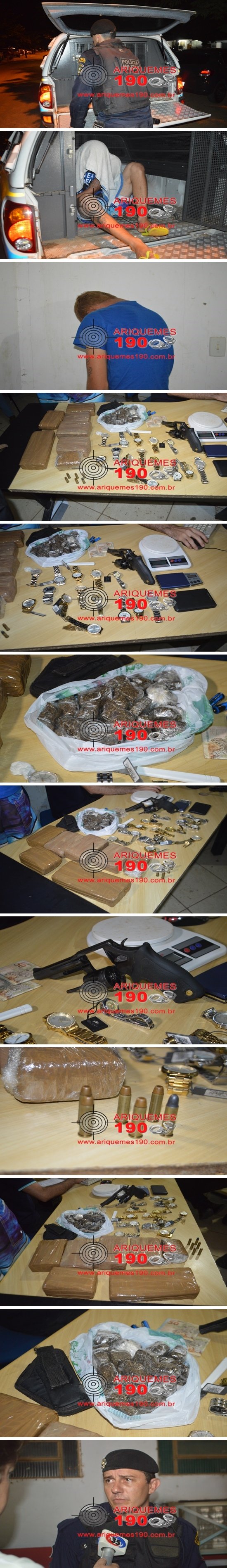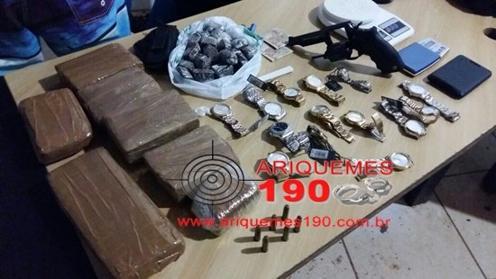 Na madrugada desta terça-feira (19/04), o Núcleo de Inteligência do 7º Batalhão da Polícia Militar recebeu a informação que uma arma de fogo utilizada para realizar um roubo acontecido horas antes em uma academia estaria na posse de um individuo conhecido como “Polaco”, residente no apartamento 01 localizado na Av. Rio Branco do Setor 09 de baixo. Em posse desta informação a guarnição realizou diligências pela localidade, sendo que os localizaram o endereço mencionado se depararam com vários indivíduos em frente ao portão, logo ao realizarem a abordagem, foi verificado que dentre os abordados, Adriano Vieira Ribeiro de 21 anos, era o “Polaco”. Adriano ao ser questionado pelos policiais afirmou que reside no endereço e que mora de aluguel no Apartamento 01. Em seguida, o infrator tentando confundir os PM’s relatou que era trabalhador, que não se envolvia em crimes e ainda afirmou que em sua residência não havia nada de ilegal, o mesmo franqueou a entrada dos Militares e logo ao entrarem na cozinha, os Policiais avistaram um revólver calibre 38 da marca Taurus que estava em cima da prateleira do guarda-roupa no quarto. Logo ao apreender a arma de fogo, os PM’s observaram que havia um tablet cortado na metade junto com a arma de fogo. Adriano afirmou que não possuía registro nem autorização para posse e porte da arma citada. Segundo o infrator, este relatou aos Militares após ser questionado se não havia mais algo ilícito dentro de sua residência, que além da arma de fogo o mesmo possuía 7 tabletes, somando aproximadamente 3 kg, mais 17 porções de entorpecente pequenas que estavam preparadas para a venda, todas do tipo maconha e as mesmas estavam em uma bolsa dentro do seu apartamento. A Perícia Técnica foi acionada e compareceu ao local para realizar seus trabalhos de praxe. No apartamento foram encontrados além da arma e das drogas, a quantia de R$500,00 em notas altas, uma calculadora cientifica da marca HP, uma faca de cozinha com cabo branco com resquícios da mesma substância aparentando ser maconha, um coldre preto, duas balanças digitais, um saco preto com 14 relógios de vários modelos, com etiqueta, porém sem nota fiscal. Dentro da mochila do rapaz foi encontrado com os tabletes um pequeno invólucro contendo substância em pó aparentando ser cocaína. Diante dos fatos, o infrator foi conduzido para a 1ª Delegacia Geral de Polícia Civil de Ariquemes onde foi registrado o Boletim de Ocorrência Policial (BOP) sob o n° 3709/2016 para as providências cabíveis.