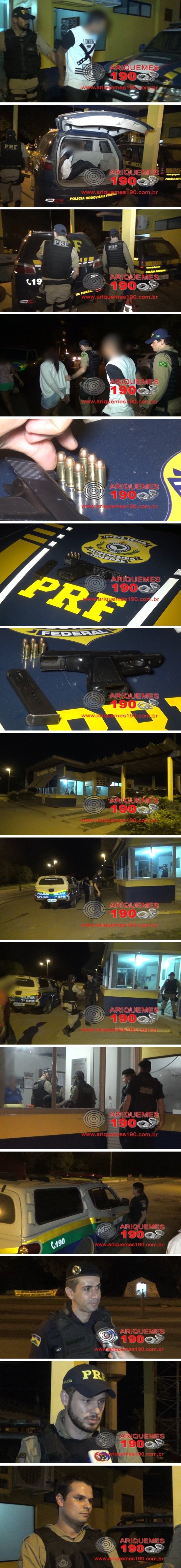 Por volta das 19h40m, desta sexta-feira os Policiais Rodoviários Federais Lange, G. Alves, Barth II e Ronierison realizavam abordagens de rotina em frente ao Posto localizado no Km-520 da BR-364 em Ariquemes, quando em dado momento deu ordem de parada a um veículo Taxi que seguia de Ariquemes sentido a Porto Velho. Os Policiais solicitaram que os ocupantes do veículo descessem e fornecessem os seus documentos de identificação. Neste momento, um dos ocupantes do veículo, apresentou a Certidão de Nascimento em nome de A.P.S.R. onde posteriormente, acabou confessando, que na verdade seu nome era E.S.S. de 27 anos de idade. Ao ser indagado quanto ao motivo da falsa identificação, o elemento assumiu que seria foragido do presídio da cidade de Jaru. Ao realizar a revista nos pertences pessoais de todos os passageiros, foi localizado na bolsa de uma mulher, uma Pistola alemã Calibre .380 com 06 munições. A guarnição da Polícia Militar também compareceu no Posto da PRF onde uma Policial feminina realizou a revista pessoal nas mulheres que foram abordadas, porém nada mais foi localizado com as mesmas. Diante do exposto, o Foragido e a mulher que estava portando a arma de fogo, foram conduzidos a Delegacia de Polícia Civil de Ariquemes, onde foi registrado o Boletim de Ocorrência Policial (BOP), para que sejam tomadas as providências que o caso requer.