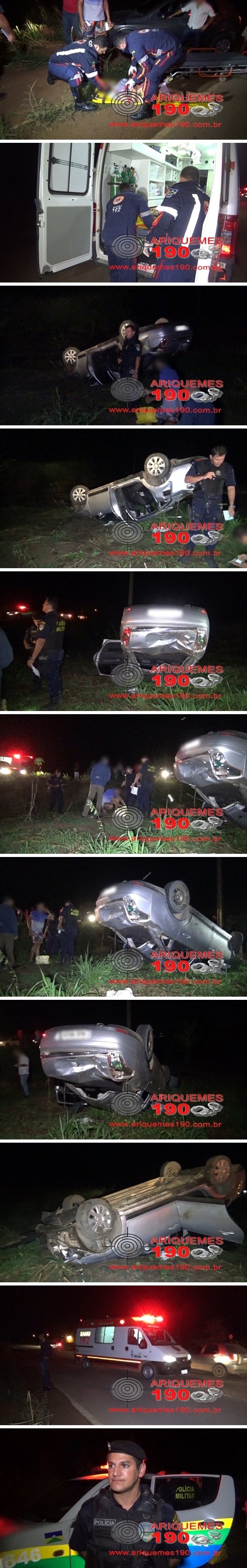 Por volta das 21h15min de domingo (24/04), o condutor G.G.A.C. de 21 anos, que seguida com seu veículo pela BR-421, no sentido Ariquemes-Monte Negro, perdeu o controle do veículo quando na altura do Km-01, o pneu dianteiro do lado esquerdo travou, fazendo com que o motorista capotasse o carro parando em um matagal fora da pista. A passageira K.S.A. de 18 anos, que está gestante, mesmo usando Cinto de Segurança, fraturou a Clavícula direita, além de algumas escoriações principalmente no Tornozelo direito e foi conduzida ao Hospital Municipal por uma equipe do Serviço de Atendimento Móvel de Urgência (SAMU). Os Policiais Militares: Moises e Buss, comandados pelo Cabo Cartaxo, foram acionados e se deslocaram para o local do acidente prestar apoio a equipe de resgate. O condutor que também usava o Cinto de Segurança nada sofreu e foi conduzido a Delegacia de Repressão aos Crimes Contra a Vida, onde foi registrada a ocorrência nº 146/16, para as devidas providências. O automóvel foi levado para uma oficina pelo guincho do Auto Socorro.
