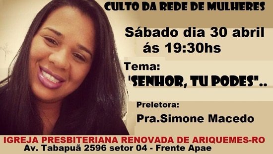A Igreja Presbiteriana Renovada convida você mulher para o Culto da Rede de Mulheres com o tema “Senhor, tu podes”. O culto será realizado neste sábado (30/04) às 19h30min com a preletora pastora Simone Macedo. A Igreja Presbiteriana Renovada de Ariquemes está localizada na Av. Tabapuã n ° 2596 Setor 04 em frente a APAE.