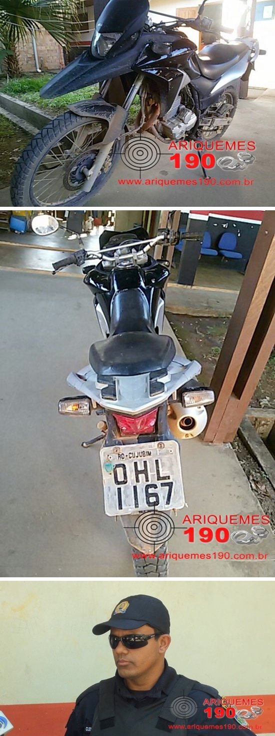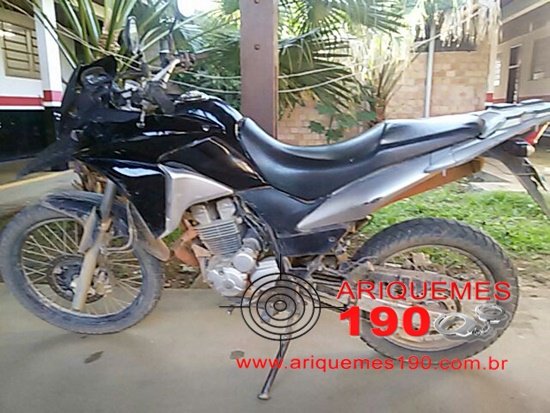 Por volta das 16 horas desta sexta-feira (29/04), os Policiais Militares da Patrulha Bravo: Cleiton Barbosa e Rafael Fonseca realizavam patrulhamento de rotina pelas ruas da cidade, quando foram informados que em uma borracharia no Setor 10 havia uma moto com possível restrição de Furto/Roubo. A guarnição foi para o local indicado, mas não encontrou o veículo, sendo que minutos mais tarde durante as buscas, a motocicleta foi localizada em frente a uma residência sem moradores, situada na 6ª Rua do Setor 10, o veículo encontrado é uma motocicleta da marca Honda, modelo XRE-300 de cor preta, placa OHL-1167/Cujubim-RO. Os Policiais realizaram consulta veicular e constaram que a referida moto havia sido roubada de uma mulher na cidade de Cujubim. Mediante os fatos a moto foi conduzida a DP e apresentada a autoridade plantonista para registro de ocorrência. O veículo apresentado na DP foi roubado da garota A.S.P. por volta das 21 horas de quinta-feira (28/04), depois de ter saído da igreja. A vítima chegava em sua residência, localizada na Avenida Maracanã, no Setor 01, quando foi abordada por um elemento moreno e magro, de estatura mediana que estava de posse de uma faca. O marginal roubou além da moto, um capacete de cor rosa e um aparelho celular da marca Samsung, modelo Galaxy de cor branco.