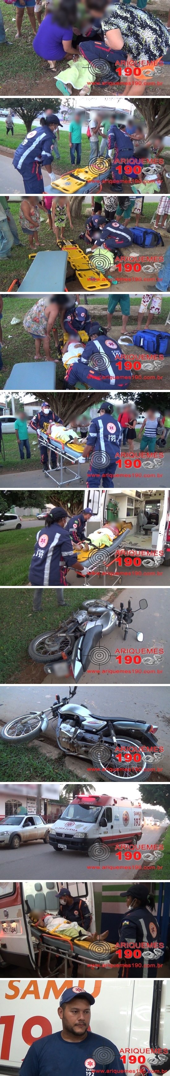 Por volta das 18 horas de quinta-feira (05/05), uma senhora de 71 anos foi atropelada por um jovem que conduzia uma motocicleta da marca Honda, modelo CG Fan prata que não sofreu escoriações, apenas reclamava de dores na perna direita. Segundo o condutor e alguns populares que presenciaram o acidente, a idosa atravessava a Avenida Jaru, no Setor 03 e quando o rapaz percebeu a presença da vítima acionou o freio do veículo, mas não teve tempo hábil de parar a motocicleta e o acidente acabou acontecendo. Uma equipe do Serviço de Atendimento Móvel de Urgência (SAMU) foi de imediato para o local e por ser uma vítima de idade avançada recebeu atendimento rápido ainda no local com sangramento na cabeça, no nariz e na boca, além de escoriações nos braços e nas pernas. O Técnico de Enfermagem Wesley que ajudou no resgate a vítima informou que a vovó deu entrada no Hospital Municipal em estado grave devido a um trauma na cabeça. Moradores da região contaram que os acidentes na Av. Jaru são constantes, já não existe na localidade qualquer tipo de redutor de velocidade.