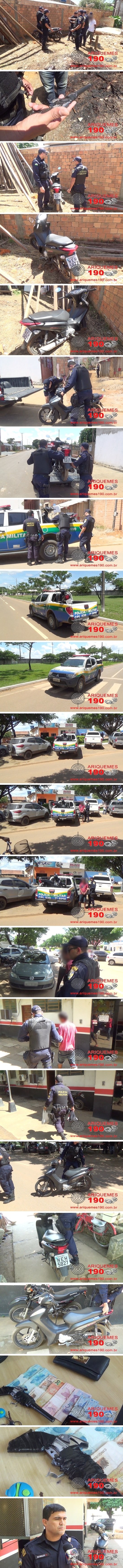 Por volta das 12h30min de terça-feira (10/05), a vítima D.S.M. de 25 anos, estava trabalhando como manicure, em uma residência localizada na Rua Minas Gerais, no Setor 05, quando um elemento moreno trajando camiseta com listras vermelhas e brancas, bermuda Jeans e chinelo, com uma arma de fogo em punho surpreendeu a manicure e a cliente C.G.S. de 27 anos. Depois de anunciar o roubo, o sujeito se evadiu do local levando um aparelho celular da marca LG de cor preto, um celular Samsung, modelo A-5 dourado, uma bolsa da marca Couro Fino, a quantia de R$ 400,00 em dinheiro e uma motoneta da marca Honda, modelo Biz 125 de cor preta, placa NEH-5828/Ariquemes. Minutos mais tarde a Central de Operações (C.O) do 7º BPM foi informada através de uma ligação anônima feita ao número de emergência 190, que um elemento estranho havia entrado com uma motoneta preta na Rua Eça de Queiroz, no Setor Bom Jesus e a deixado no quintal de alguns apartamentos, onde foi localizada pelos Policiais Militares da Patrulha Delta: Rudey e Dombroski, comandados pelo Cabo Reginaldo. Durante as investigações os Policiais foram informados que o suspeito P.M.R.S.S. de 21 anos, era sobrinho do proprietário dos apartamentos e que tinha chegado do Estado do mato Grosso a cerca de 20 dias. Os Policiais de posse das características e das novas roupas do suspeito iniciaram as buscas e de longe observaram um elemento que tinha acabado de descer de um moto taxi e entrado em um salão de beleza nas proximidades de onde a Biz roubada foi localizada. O sujeito foi abordado e de pronto confessou o delito, sendo localizada em sua bermuda a quantia de R$ 291,00 em dinheiro, um aparelho celular da marca LG, a chave e o alarme da Biz. O próprio indivíduo disse que possui diversas passagens pela Polícia por Roubo, próximo da motoneta foi encontrado a bolsa da vítima e o simulacro de uma arma de fabricação caseira, que não funciona. Mediante os fatos o marginal foi apresentado a autoridade plantonista na Delegacia de Repressão aos Crimes Contra o Patrimônio, onde foi registrada a ocorrência nº 1414/16, para as devidas providências.