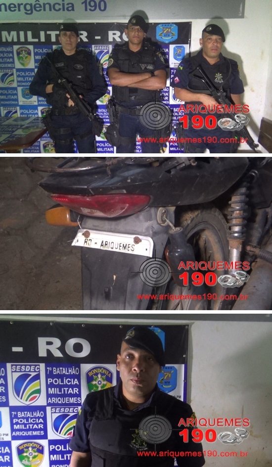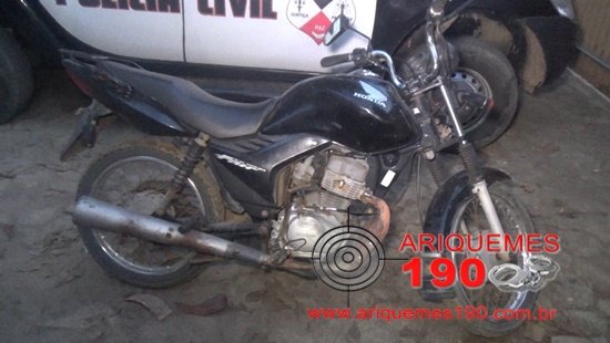 Por volta das 15h30min de sábado (14/05), os Policiais Militares de Monte Negro: Rocha e Campos, comandados pelo Cabo Alexandrino, realizavam patrulhamento de rotina pelo distrito de Joelândia, quando foram informados por populares que em uma mata nas proximidades um elemento que vem assolando a localidade com diversos delitos, tinha escondido uma motocicleta da marca Honda, modelo CG Fan 125 de cor preta, sem placa. A guarnição foi o local indicado e encontrou a referida moto, sendo que em consulta veicular foi constatada uma restrição de Furto, conforme ocorrência nº 4595/16, registrada na Delegacia Geral. Através do número do chassi os Policiais confirmaram que a motocicleta tinha a placa NDZ-7954/Ariquemes. O veículo foi apresentado à autoridade plantonista na Delegacia de Repressão aos Crimes Contra o Patrimônio em Ariquemes, onde foi registrada a ocorrência n° 1466/16, para as devidas providências.