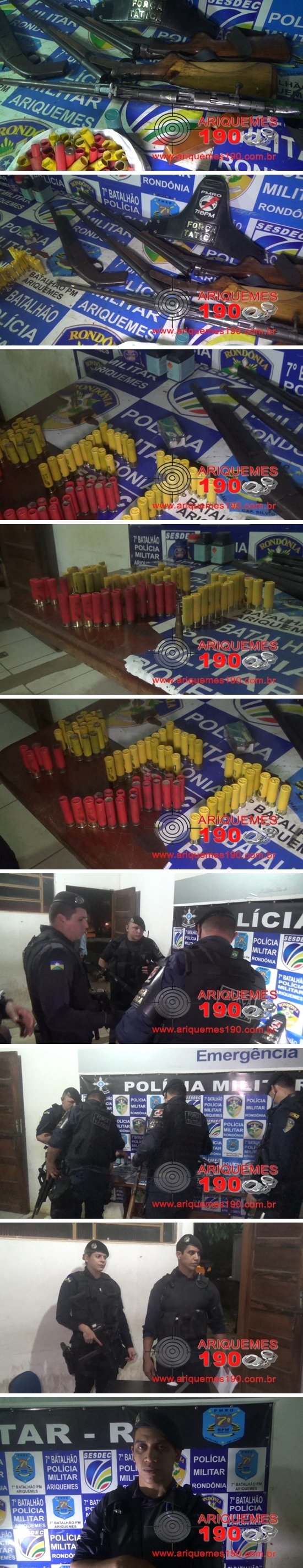 Por volta das 23 horas de sábado (14/05), os Policiais Militares da Força Tática realizavam abordagens em frequentadores de alguns bares localizados ao longo da estrada que vai ao Distrito de Bom Futuro, sendo que em um dos bares, os Policiais localizaram o indivíduo A.A.F. de 43 anos, que ao ser conduzido ao quartel do distrito começou a esbravejar dizendo que bandidos os Policiais não prendiam e que há alguns dias alguém tinha entrado em sua residência e roubado seus pertences, mas que ia descobrir quem era o ladrão e lhe dar um tiro. Os Policiais perguntaram com o que ele ia atirar no ladrão, mas o suspeito não respondeu então os Policiais foram até a sua residência e localizaram quatro armas de fogo de calibres diferente e uma de calibre desconhecido, além de dezenas de munições de vários calibres. Contra o sujeito a guarnição encontrou o mandado de Prisão nº 114-29.1996.8.11.0023.0001 de 30 de agosto de 2013, expedido pela Juíza Cristhiane Trombini Puia Baggio, da 1ª Vara Cível e Criminal da Comarca de Peixoto de Azevedo- Mato Grosso. O indivíduo, as armas e as munições foram apresentados à autoridade plantonista na Delegacia Geral em Ariquemes, onde foi registrada a ocorrência nº 4632/16, para as devidas providências.