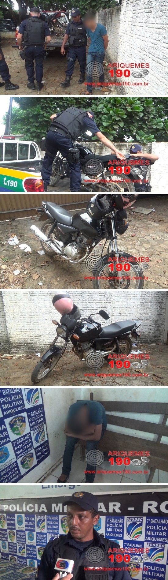 Por volta das 16h00min desta quinta-feira (19/05), a guarnição da Polícia Militar estava em patrulhamento pela Rua Alvares de Azevedo no Setor Colonial em Ariquemes, onde os Policiais avistaram uma motocicleta da marca Honda modelo CG de cor preta com a placa NEB-7063 estacionada em frente a uma residência. Os Policiais ao realizarem consulta veicular constataram que o veículo possuía restrição de roubo conforme o BOP sob n° 1533/2016 registrado na 3ª DPC no dia (18/05) quarta-feira. Diante da situação, os Policiais entraram em contato com o proprietário da residência que os informou que seu genro chegou com a motocicleta e o mesmo se encontrava no quarto ao lado. Em ato contínuo os Policiais localizaram o menor dentro do quarto deitado na cama, ao ser feito a abordagem foi localizado com o rapaz a chave do veículo e dois capacetes. Segundo o menor, este relatou que havia comprado o veículo pela manhã. Diante dos fatos, o infrator juntamente com a motocicleta foram conduzidos e apresentados na Delegacia Especializada no Atendimento a Mulher onde foi registrado o Boletim de Ocorrência Policial (BOP) sob o n° 800/2016 para as providências cabíveis. O menor havia sido apreendido no dia 16/05 (segunda-feira) com uma motoneta da marca Honda modelo Biz de cor preta roubada.