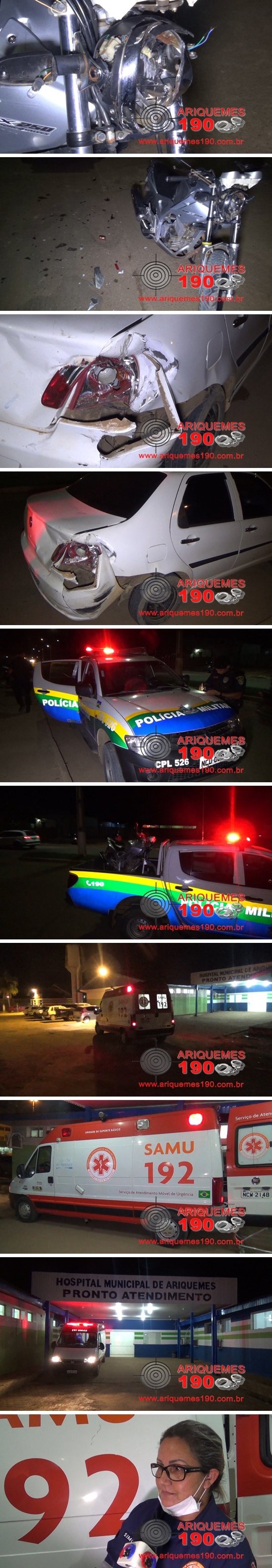 Por volta das 19 horas desta terça-feira (24/05), a equipe do Serviço de Atendimento Móvel de Urgência (SAMU) foi acionada a comparecer na Av. Machadinho no Bairro Bom Jesus em Ariquemes, pois segundo informações havia ocorrido um acidente de trânsito. De imediato os socorristas se deslocaram até o local onde se depararam com a vítima ao solo se queixando de dores na região da coxa da perna esquerda. Logo os socorristas iniciaram o atendimento pré-hospitalar (APH) à mulher. Após os primeiros socorros prestados à vítima, a mesma foi encaminhada para o Hospital Regional de Ariquemes. A Polícia Militar foi acionada e compareceu ao local onde esteve realizando os trabalhos de praxe. Segundo informações levantadas no local, o casal vinha transitando de motocicleta da marca Honda modelo Twister de cor cinza pela Av. Machadinho, quando acabou colindo na traseira de um carro da marca Fiat modelo Siena de cor branco após o mesmo fazer o retorno. Após deixarem a mulher no Pronto Socorro do Hospital Regional, o SAMU retornou ao local do acidente e prestaram o atendimento pré- hospitalar (APH) ao condutor da motocicleta, posteriormente o mesmo foi levado para o Hospital. Em entrevista concedida ao Canal 35 e Site Ariquemes 190 a Técnica de Enfermagem Simone relatou que aparentemente as duas vítimas não sofreram nenhuma escoriação grave.