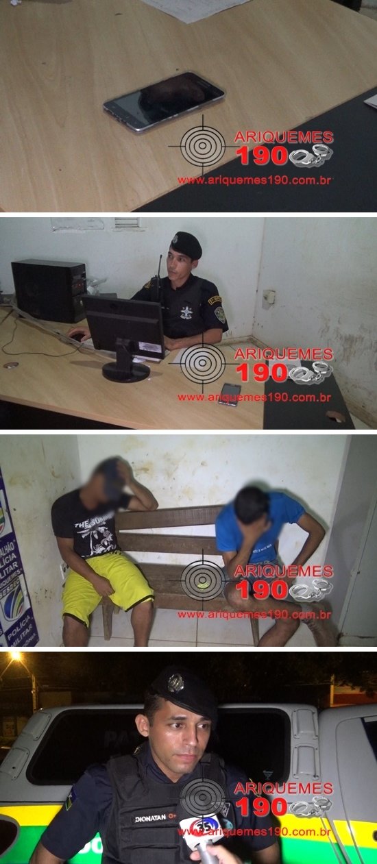 Por volta das 21h30min desta quinta-feira (26/05), a guarnição da Polícia Militar se deslocou até a 1ª Rua do Setor 02 de Ariquemes após receber uma denúncia que relatava que havia acontecido um roubo a pessoa na Av. Tancredo Neves e os infratores haviam se evadido sentido a 1ª Rua do Setor 02, onde os mesmos estariam sentados em um bar. Diante das informações, os Policiais localizaram dois rapazes com as características dos infratores sentados em um bar. Logo os Policiais realizaram abordagem e revista pessoal nos indivíduos, momento em que foi localizado no bolso da bermuda de um dos elementos um aparelho celular da marca Gran Prime de cor marrom. Segundo a vítima, esta relatou que estava transitando na Av. Tancredo Neves, quando em dado momento dois elementos a abordaram e utilizando-se uma faca a mandaram que seguisse na direção de um terreno onde havia uma construção. Diante grave ameaça os elementos subtraiu da vítima um aparelho celular da marca Samsung modelo Gran Prime de cor marrom. Em seguida os infratores evadiram-se sentido Av. JK. Diante dos fatos, os elementos e a vítima foram conduzidos e apresentados na 3ª Delegacia de Polícia Civil de Ariquemes especializada na Repressão aos Crimes Contra o Patrimônio onde foi registrado o Boletim de Ocorrência Policial (BOP) sob o n° 1622/2016 para as providências cabíveis.